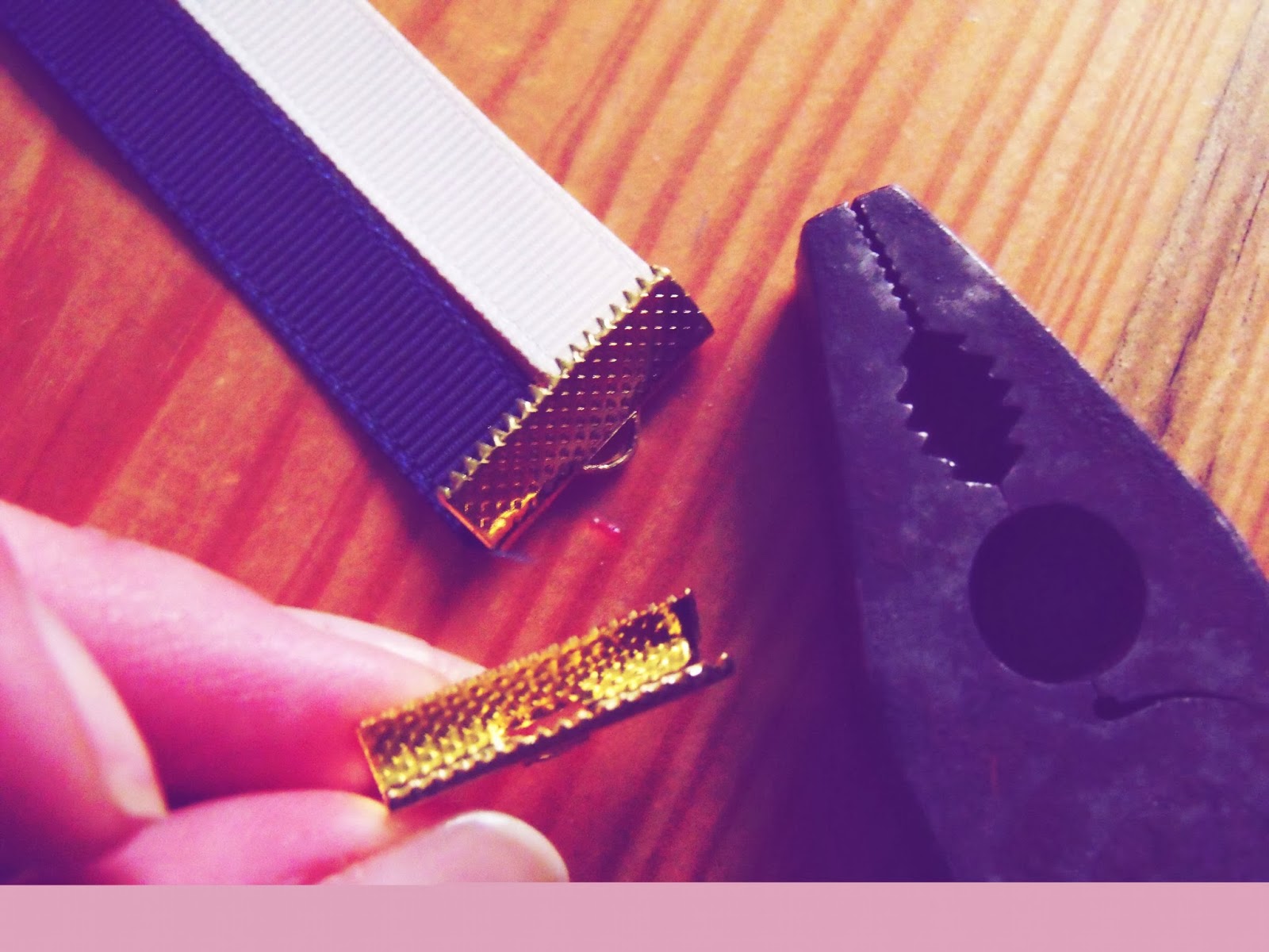5. Końce tasiemek łączymy zaciskami, potrzebne będą nam tutaj kombinerki by dobrze zacisnąć metalowy element.