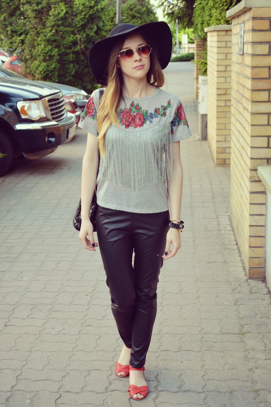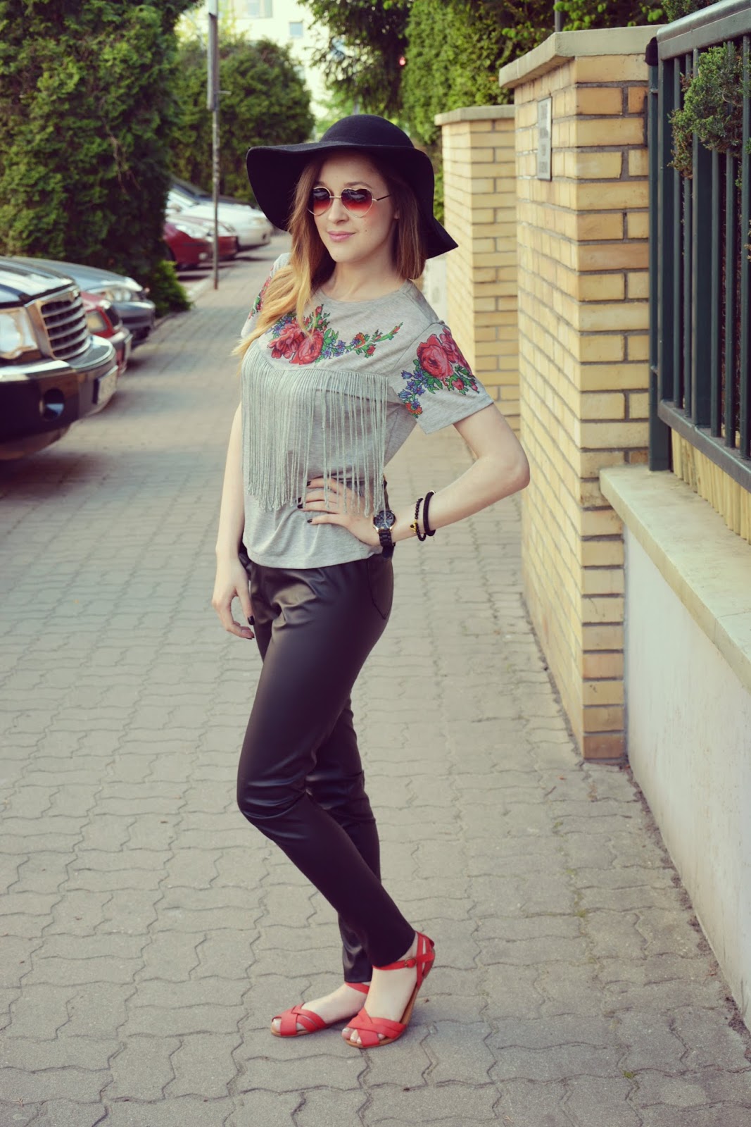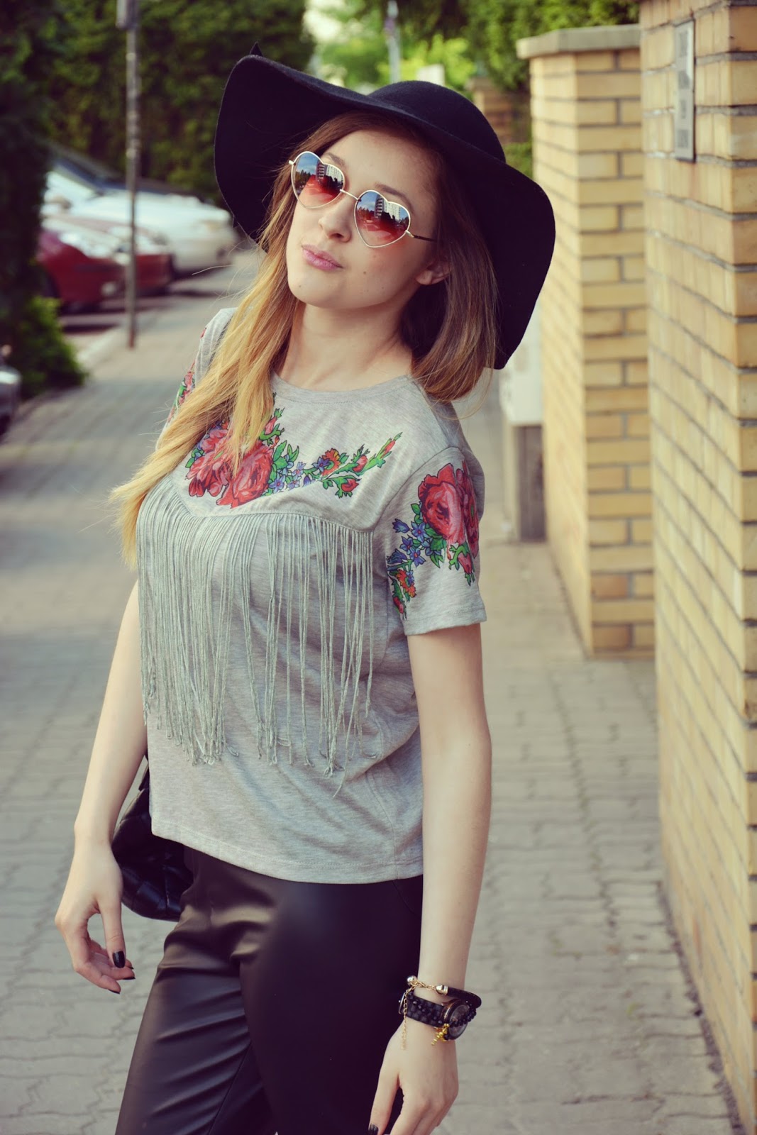 Dziś chciałabym wam zaprezentować stylizację na co dzień. Zresztą niemalże każda moja stylizacja jest prosta, zwyczajna, luźna – taka na co dzień – bo tak lubię najbardziej. Przeglądając ofertę jednego z internetowych sklepów natrafiłam na poniżej przedstawioną koszulkę. Spodobała mi się tak bardzo z racji nietuzinkowego, kwiatowego wzoru i frywolnych frędzli, że nie mogłam jej sobie odmówić. Powiem szczerze, że trochę się naczekałam na tą koszulkę ale producent zachował się w tej sytuacji wzorowo, ponieważ po zgłoszeniu sprawy, że czas oczekiwania wydłuża się już niemiłosiernie – koszulka i kapelusz dotarły do mnie w ekspresowym tempie. Obie te rzeczy zostały zamówione TUTAJ. Do koszulki założyłam czarne, połyskujące rurki oraz czerwone sandałki. Na nos nasadziłam fikuśne okulary (TUTAJ) w kształcie serc. Biżuteria to gumowy zegarek oraz mix bransoletek. Całość zamyka pikowana torebeczka.