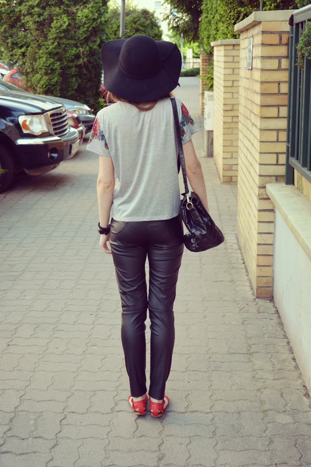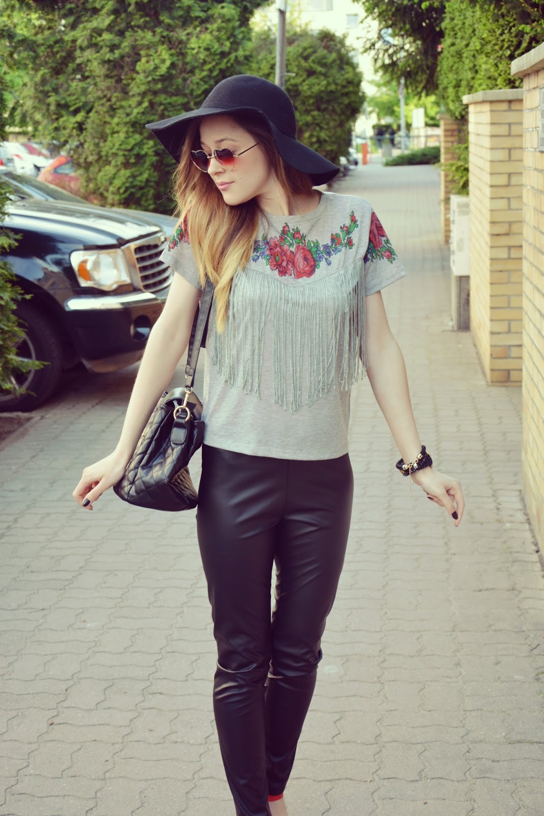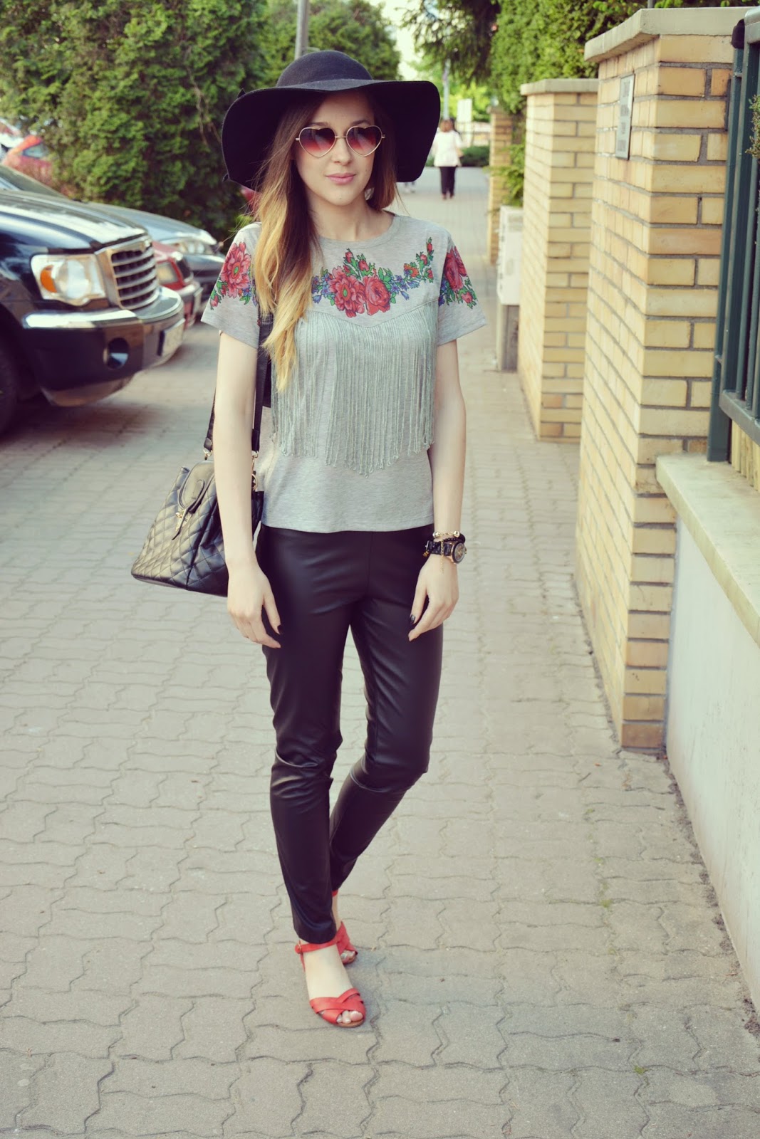 Dziś chciałabym wam zaprezentować stylizację na co dzień. Zresztą niemalże każda moja stylizacja jest prosta, zwyczajna, luźna – taka na co dzień – bo tak lubię najbardziej. Przeglądając ofertę jednego z internetowych sklepów natrafiłam na poniżej przedstawioną koszulkę. Spodobała mi się tak bardzo z racji nietuzinkowego, kwiatowego wzoru i frywolnych frędzli, że nie mogłam jej sobie odmówić. Powiem szczerze, że trochę się naczekałam na tą koszulkę ale producent zachował się w tej sytuacji wzorowo, ponieważ po zgłoszeniu sprawy, że czas oczekiwania wydłuża się już niemiłosiernie – koszulka i kapelusz dotarły do mnie w ekspresowym tempie. Obie te rzeczy zostały zamówione TUTAJ. Do koszulki założyłam czarne, połyskujące rurki oraz czerwone sandałki. Na nos nasadziłam fikuśne okulary (TUTAJ) w kształcie serc. Biżuteria to gumowy zegarek oraz mix bransoletek. Całość zamyka pikowana torebeczka.