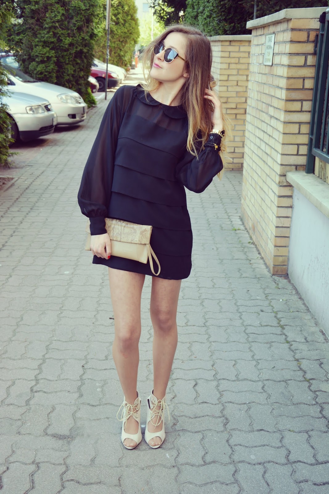 Z tego również sklepu pochodzi gwiazda dzisiejszej stylizacji, czyli mała, czarna sukienka. Piękne zakładki, kołnierzyk typu pensjonarka i prześwitujący materiał na rękawach tworzą niepowtarzany charakter tej kreacji. Mroczą czerń przełamałam beżowymi butami i kopertówką. Bransoletki to mój mały mix.