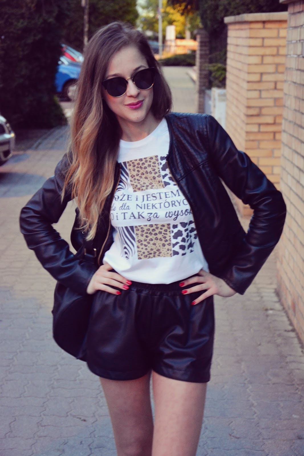 Dzisiejsza stylizacja jest prosta, luźna tak jak lubię. Koszula została zaprojektowana przeze mnie. Lubię tworzyć coś od nowa, widzieliście to już nie raz na moim blogu. Nawet jeśli producent ma coś wspaniałego w swojej ofercie muszę dodać swoje 5 groszy, jak nie logo bloga to napis, czy grafikę koszulki. Nie zastanawiałam się nawet długo nad tym co ma być umieszczone na koszulce. Wiedziałam, że chce połączyć motyw zwierzęcy z napisem. Nie mam programu do tworzenia własnej grafiki więc przewertowałam przeglądarkę w poszukiwaniu trzech niebanalnie przedstawionych motywów: zebry, panterki i łatek. Połączyłam je w całość i po środku dodałam napis. Nie jestem pisarzem i wymyślanie życiowych haseł nie przychodzi mi z łatwością więc poszłam na skróty i wybrałam ten, który najbardziej przypadł mi do gustu: „Może i jestem niska ale dla niektórych to i tak za wysoko„. Oczywiście nie można zapomnieć o tym kto spełnia takie zachcianki i bez problemu drukuje na koszulkach to o co proszę. Chciałabym z całego serca podziękować załodze PIXELDRUK. T-shirt wygląda fenomenalnie, jakość koszulki jest bardzo wysoka, wszystko wyszło tak jak chciałam. Delikatnie rockowy styl podkręciłam czarną, klasyczną ramoneską, skórzanymi szortami oraz skórzanym plecakiem z motywem panterki. Na nos nałożyłam ulubione okulary. Buty mieliście już okazje widzieć na blogu. Bardzo się wam one spodobały, a ja z szczerze polecam ich zakup, ponieważ te lordsy są bardzo wygodne. Całość prezentuje się tak jak widzicie poniżej.