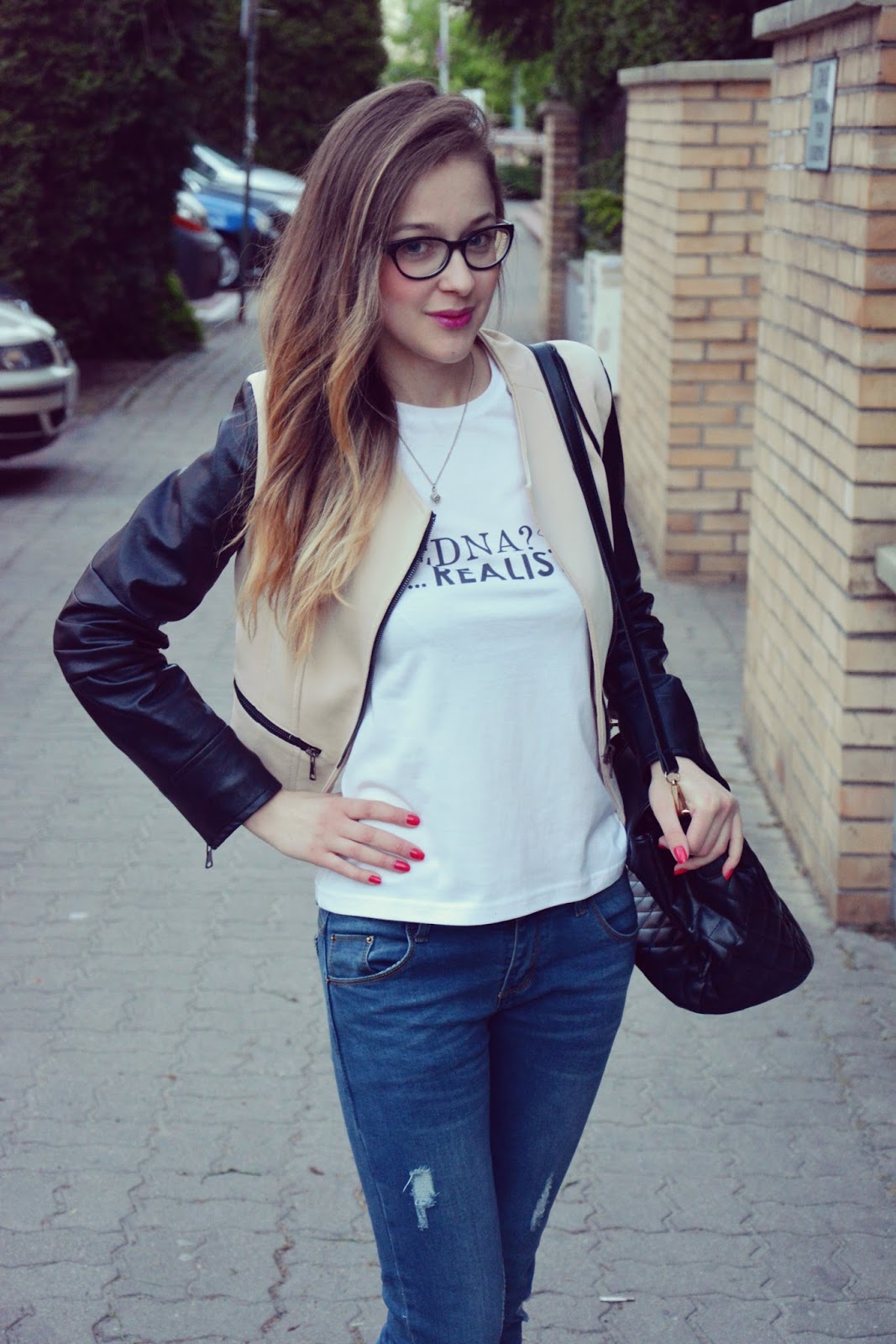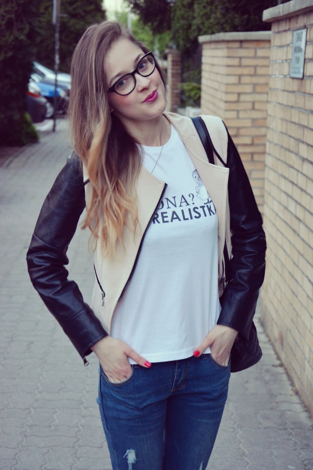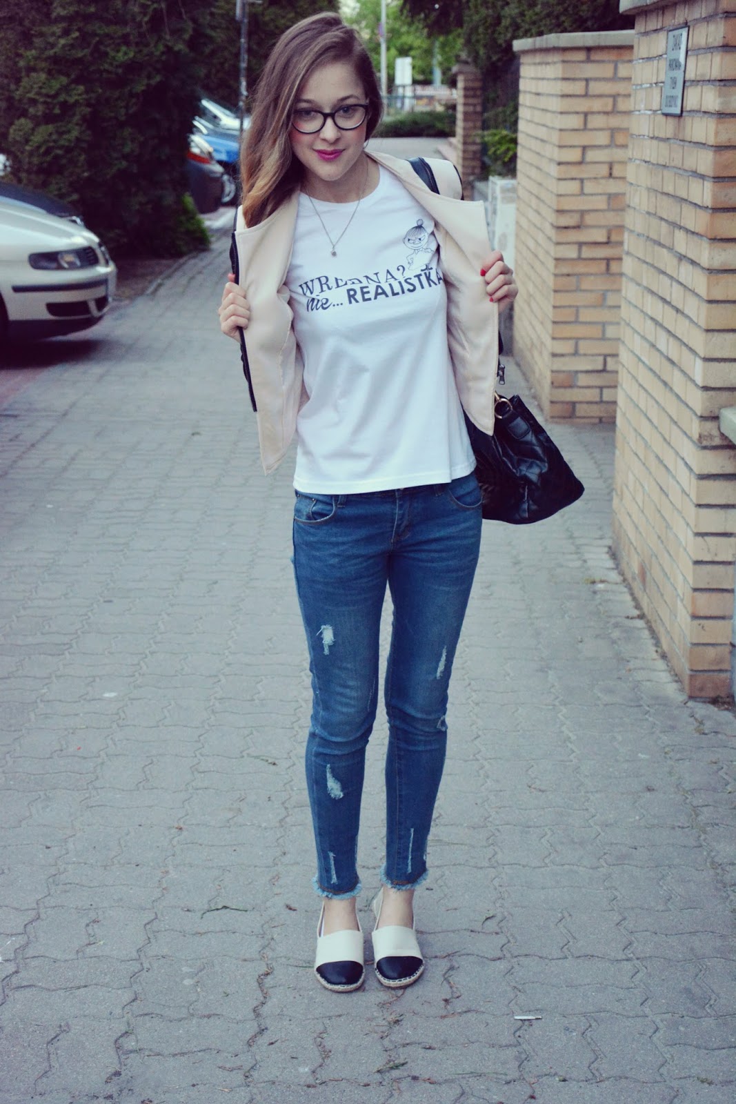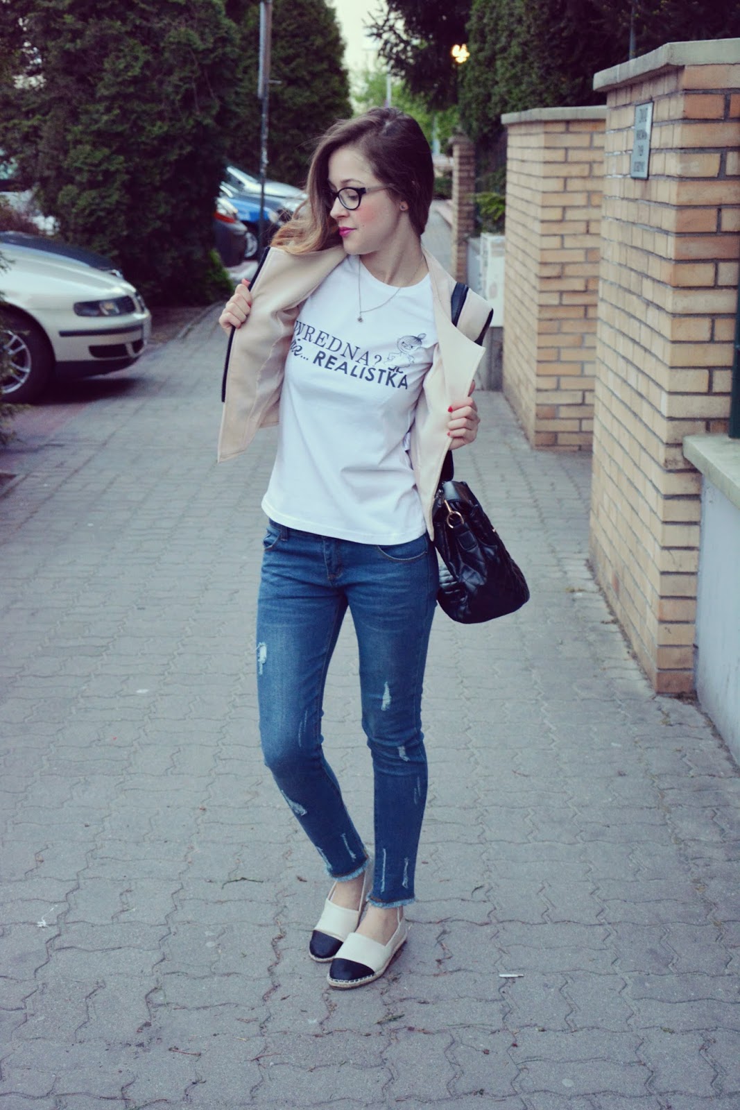 Poniższa stylizacja skomponowana jest z koszulki od PIXELDRUK. Tym razem widnieje na niej napis „WREDNA? nie Realistka”. Ramoneska w kolorze beżu ze skórzanymi rękawami (TUTAJ) idealnie współgra z espadrylami w takich samych kolorach. Jeansy z przetarciami (TUTAJ) to mój ulubiony model. Kiedyś zamówiłam identycznie, jednak rozmiar za małe. Więc oddałam je w dobre ręce. Dziś znowu mogę cieszyć się z wygodnych jeansów w szafie. Biżuteria, którą założyłam do tej stylizacji jest delikatna i subtelna: kolczyki w kształcie serduszek i wisiorek w kształcie kostki do gry. Cudowności te pochodzą ze strony JUBILEO.PL . Ważne jest również to, że biżuteria pochodząca z tego sklepu jest dobrej jakości i do tego za grosze. Można się obkupić za niewielkie pieniądze 🙂