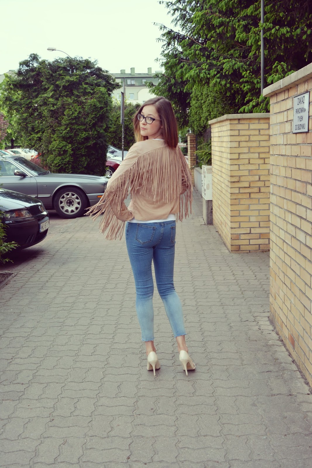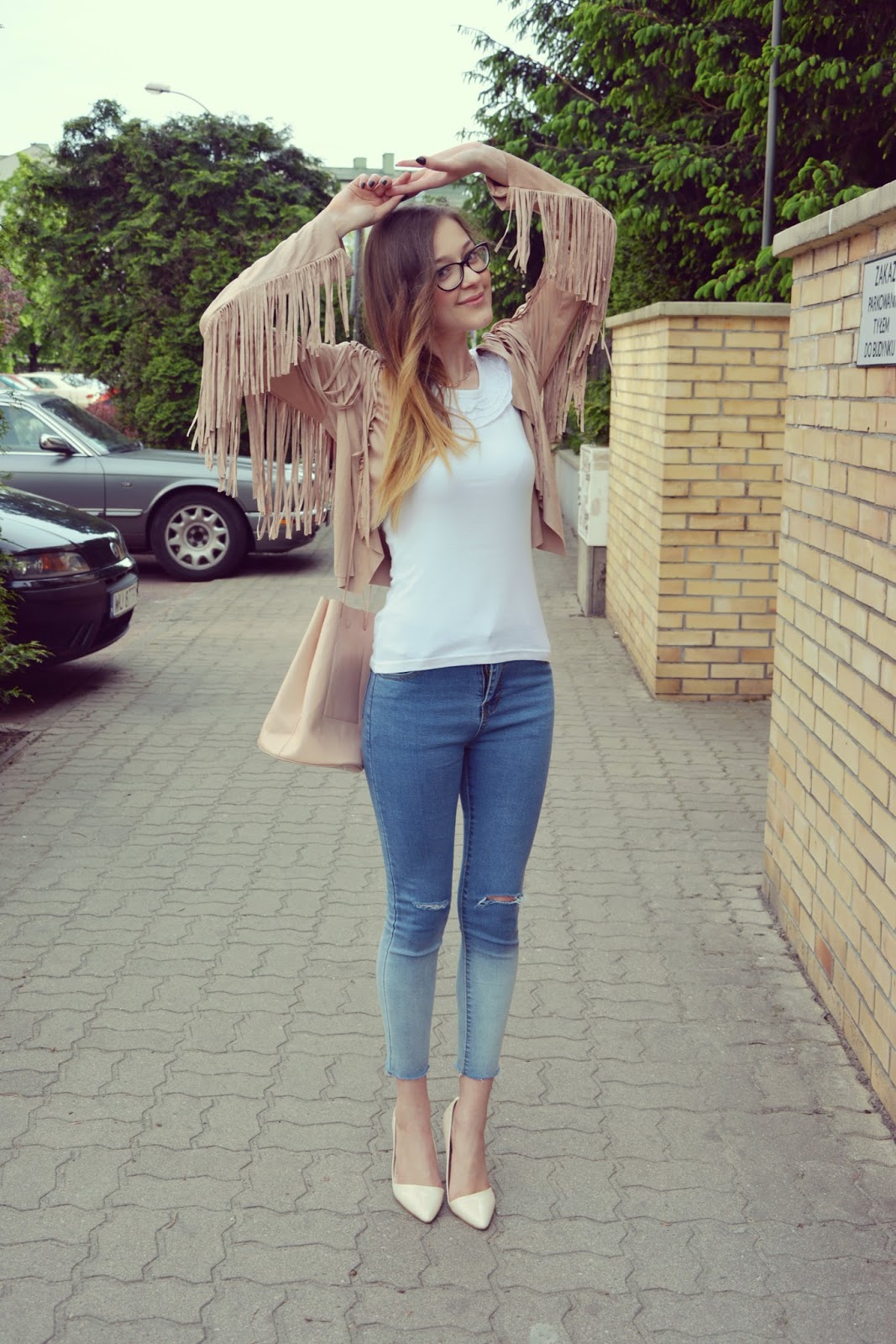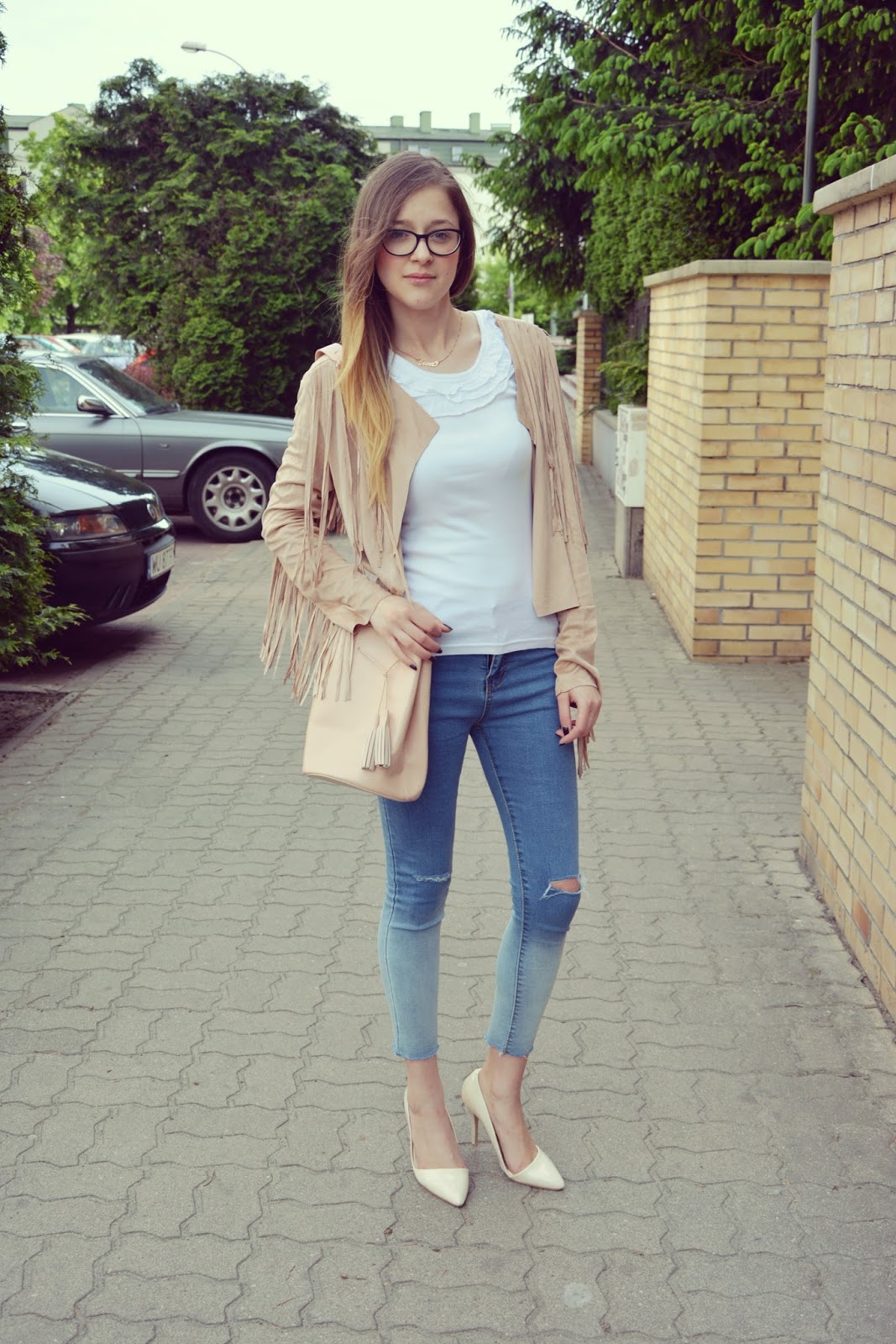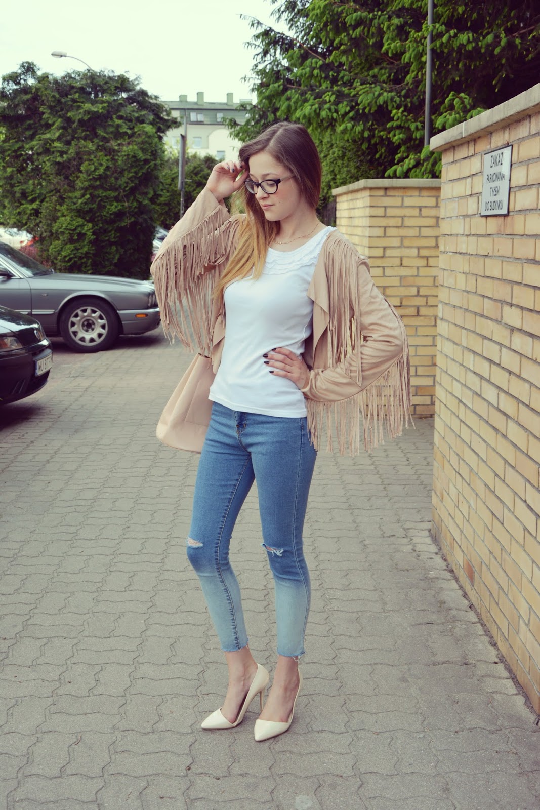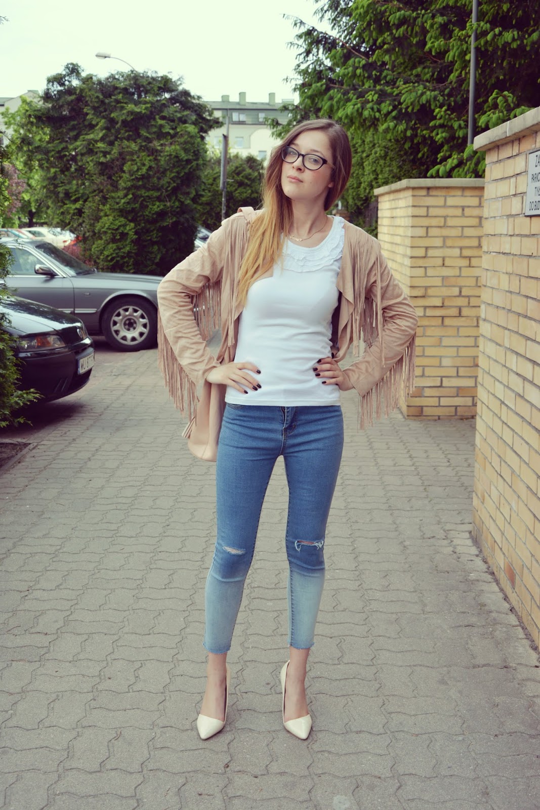 Dzisiejsza stylizacja, którą chciałabym wam zaprezentować jest jedną z moich ulubionych. Zwiewna narzutka z frędzlami (TUTAJ) to kolejny zakup do którego musiałam dojrzeć. Za każdym razem, gdy widziałam ją w ofercie jakiegoś sklepu, zawsze wygrywało coś innego. Polecam ją każdemu jest wyjątkowa, wykonana z wysokiej jakości materiału. Kolejną gwiazdką w tym zestawie są jeansy (TUTAJ) w stylu ombre z rozcieńciami na kolanach. Idealnie podkreślają figurę i dopasowują się do ciała, jak druga skóra. Torebka w łososiowym kolorze tworzy zgrany duet z asymetrycznymi szpilkami w kolorze beżu. Na nos założyłam urocze okulary (TUTAJ) w ksztłacie sreca .