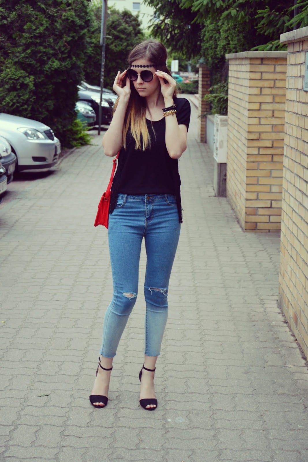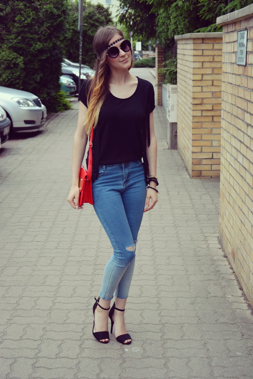 W dzisiejszej stylizacji chciałabym wam zaprezentować aż dwa produkty dostępne w Bonprix. Pamiętam jak jeszcze kilka lat temu prenumerata przychodziła do mnie do domu, a ja oglądałam i wybierałam ubrania które chciałabym mieć. Dziś już podrosłam i mogę pozwolić sobie na takie ubrania. Sentyment pozostał ale i nastał czas zachwytu i efektu „łał” po rozpakowaniu przesyłki. To co przykuło moją uwagę na pierwszy rzut oka to nienagannie zapakowana każda rzecz. Wśród tych ubrań znalazła się czarna bluzeczka z frędzlami (TUTAJ) oraz czerwona listonoszka ze złotą blaszką (TUTAJ). Jeansy ombre (TUTAJ) były już prezentowane na blogu, ostatnio ubieram je bardzo często – chyba moje ulubione 🙂 Dodatki to okulary (TUTAJ), sandałki oraz opaska którą wykonałam sobie sama 🙂