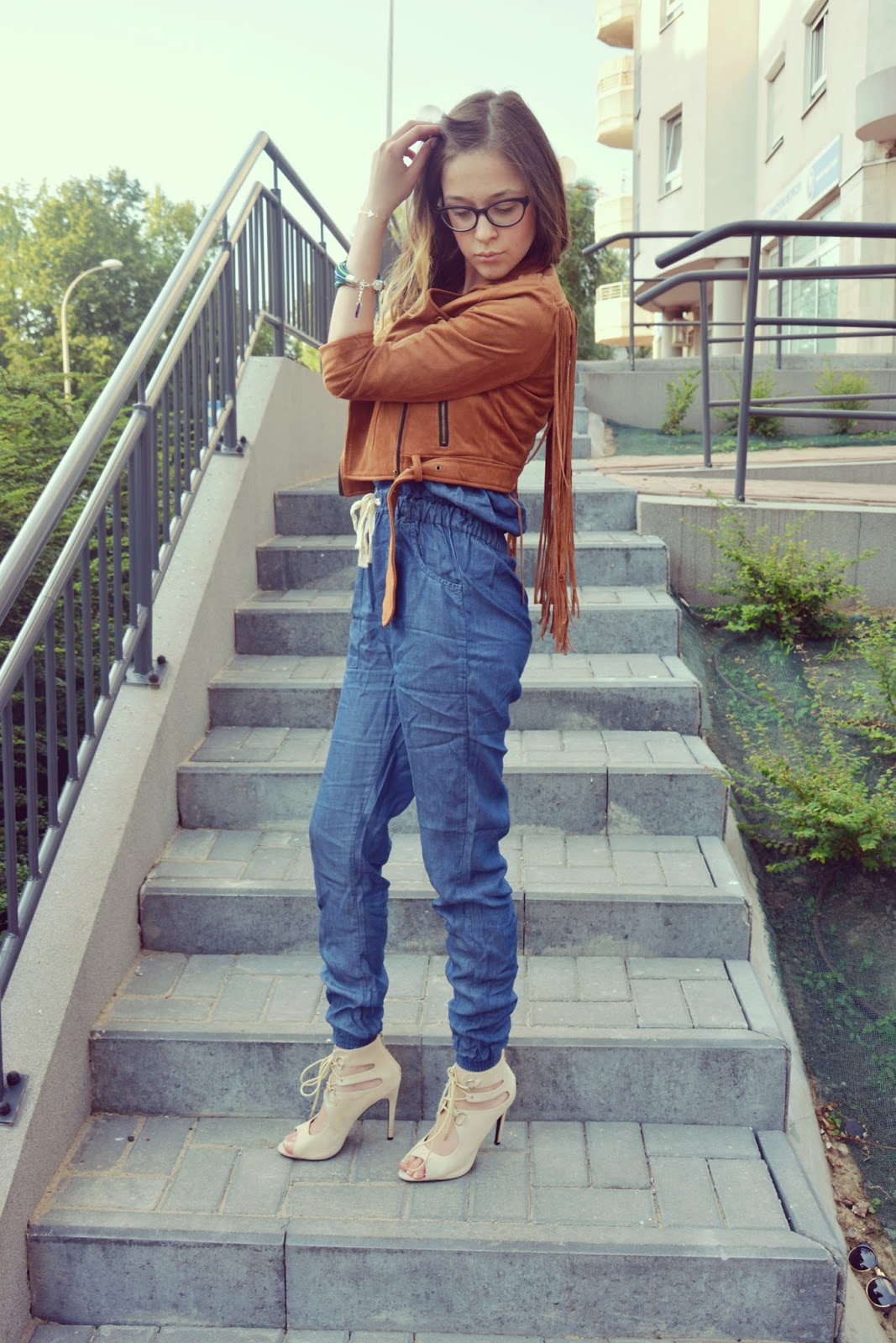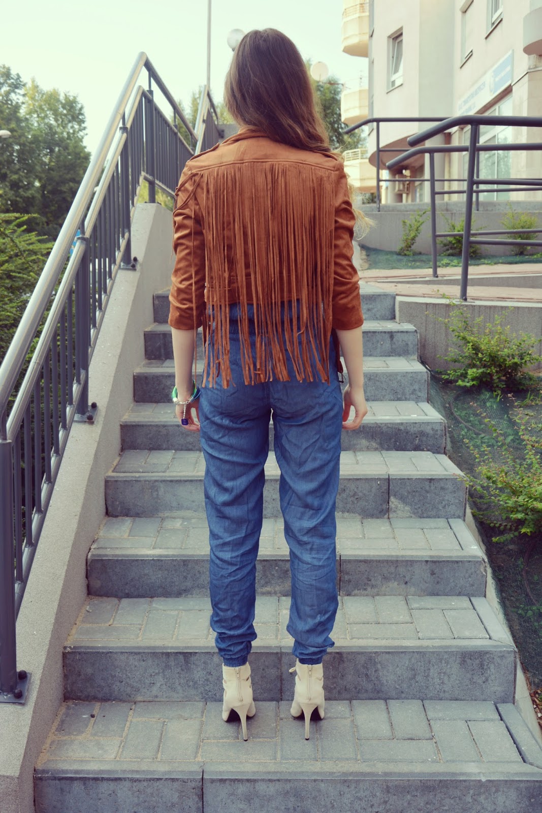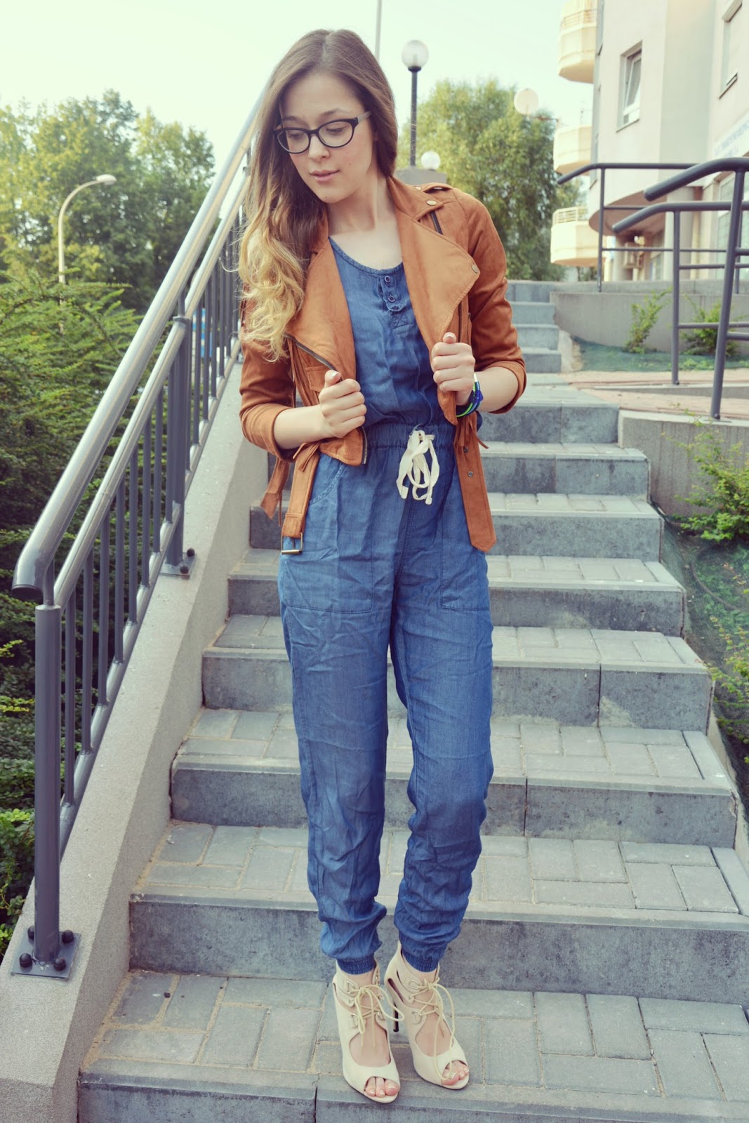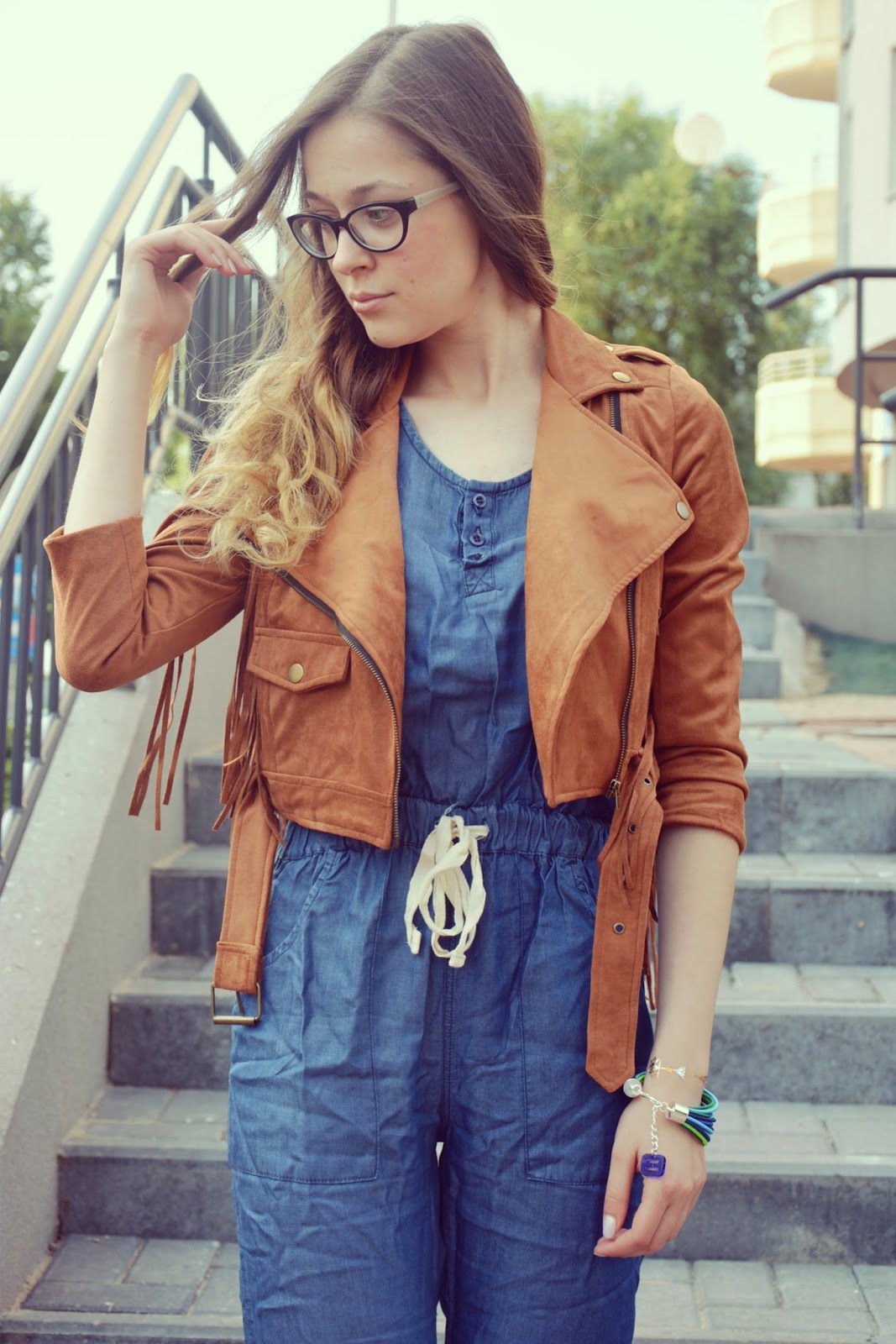 Dzisiejsza stylizacja składa się z kurteczki (TUTAJ) w stylu boho z frędzelkami na plecach, w pięknym, czekoladowym kolorze. Pod kurteczką znajduje się jeansowy kombinezon (TUTAJ) zawiązywany w pasie, z guziczkami przy dekolcie, na szerokich ramiączkach i z ściągaczami na kostkach. Do całości założyłam sandałki w kolorze beżu na obcasie oraz piękną bransoletkę w odcieniach niebieskiego i zielonego marki ENCE PENCE. Jeśli nie znacie jeszcze tej marki to koniecznie się z nią zapoznajcie. To nie tylko sprzedaż kolorowej biżuterii – by „ŻYĆ KOLOROWO” – ale wielka pasja i serce do pomagania innym…