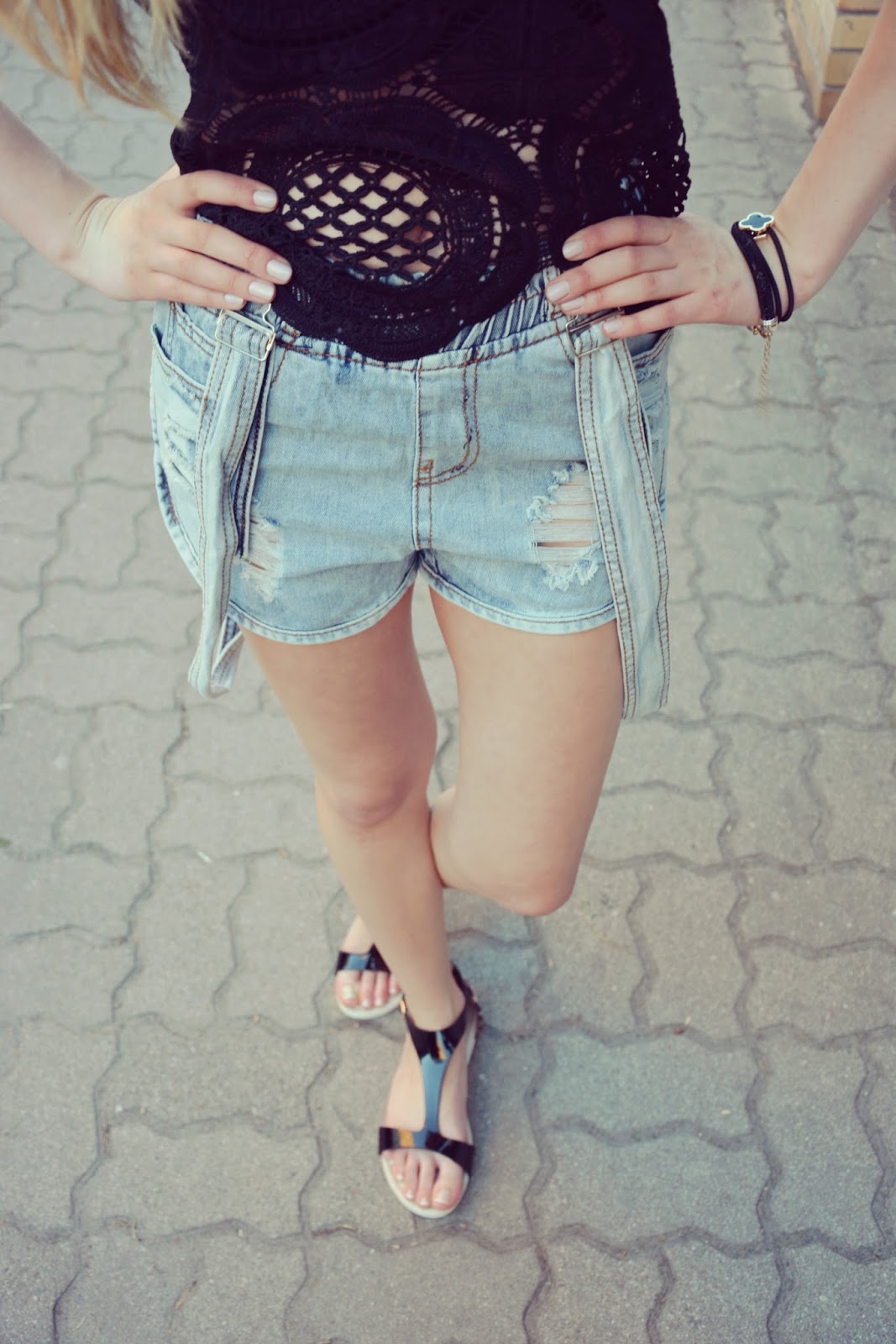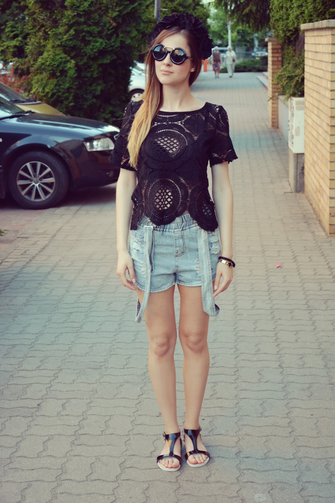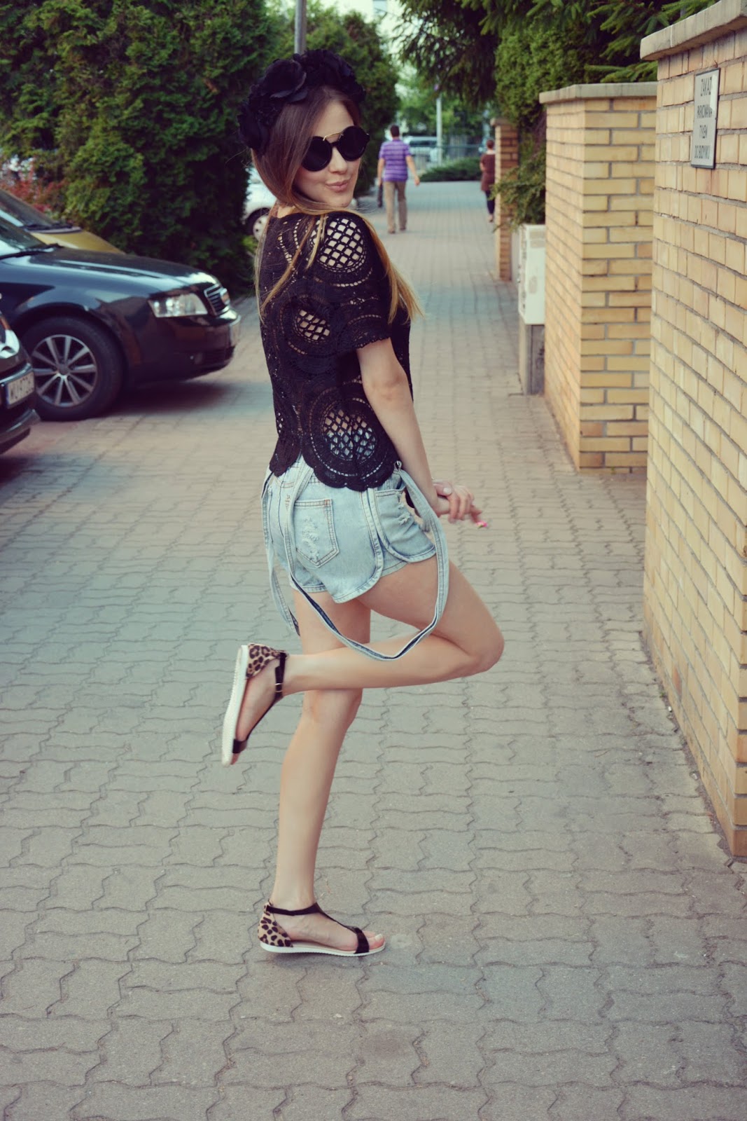 Dzisiejsza stylizacja składa się z jeansowe szortów na szelkach (TUTAJ), które są bardzo wygodne i mają w swoim kroju ciekawe dodatki. Dzięki temu spodenki nie wyglądają jak zwykłe szorty. Czarna, koronkowa bluzeczka (TUTAJ) idealnie współgra z koroną. Co do korony to powiem szczerze, że długo na taką polowałam, aż tu nagle, przypadkiem znalazłam ją w promocji za jedyne 10zł w HM. Oczywiście nie wychodzę w niej na codzień na ulicę ale na plażę lub spacer po łące wzięłabym ją chętnie 🙂 Moje ulubione i bardzo wygodne sandałki w panterkę z czernią dopełniają całości.