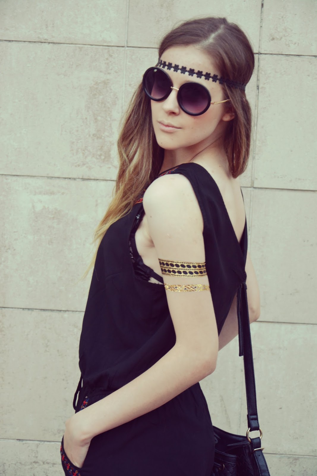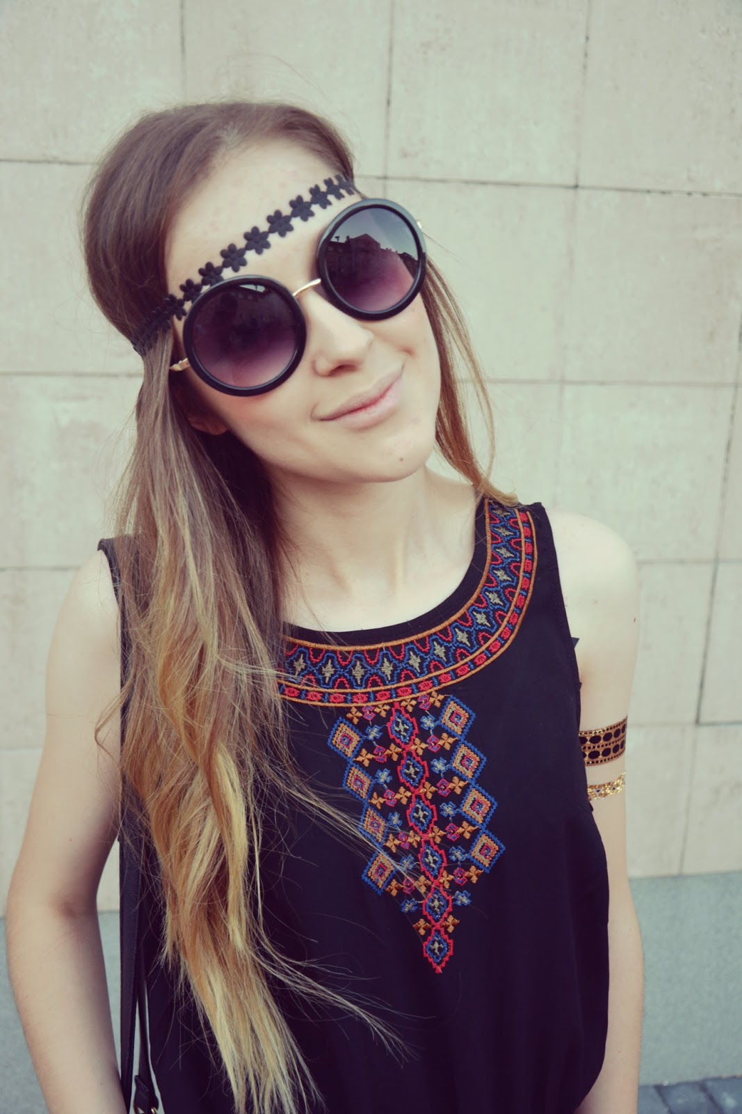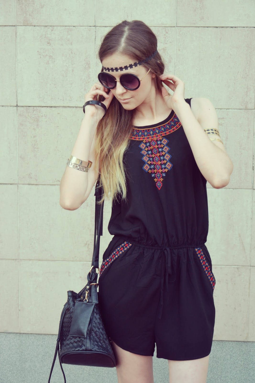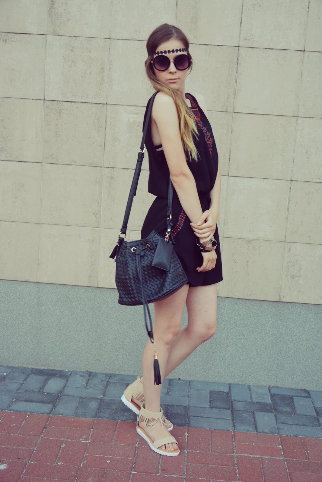 Dzisiejsza stylizacja jest ostatnio jedną z moich ulubionych. Klasyczny, czarny kombinezon (TUTAJ) z elementami pięknie wyszytego, etnicznego wzoru to strzał w dziesiątkę. Jest bardzo wygodny, nie krępuje ruchów, na biodrach jest ściągacz, a na plechach zamek. Do kombinezonu dobrałam czarną, plecioną torebkę (TUTAJ) oraz buty z frędzlami – są bardzo, bardzo wygodne. Dodatki to moja opaska DIY, okularki much i metalowe bransoletki.