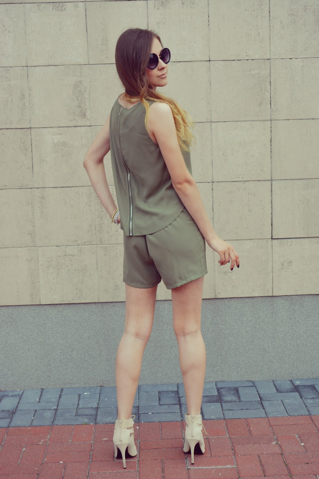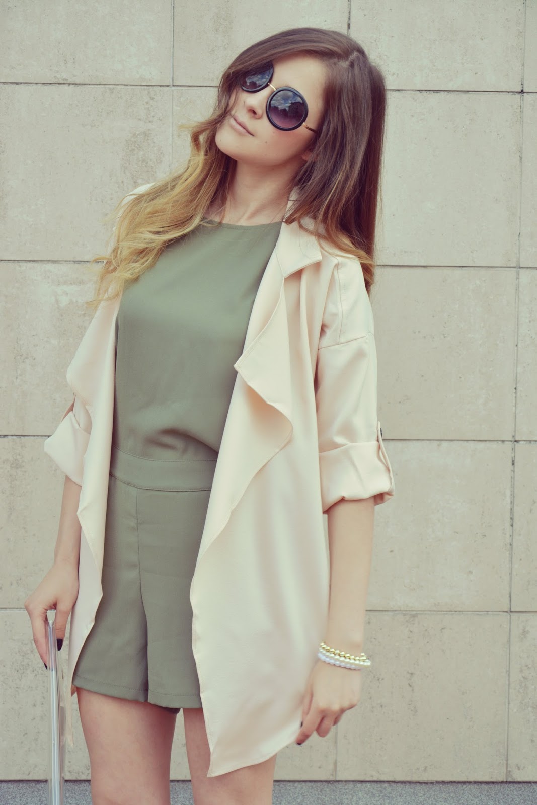 Ostatnio w mojej szafie zawojowały dwa odcienie beżu i khaki. Więc kilka sesji będzie królowało w tych odcieniach 🙂 Dzisiaj prezentuję wam jedną z nich. Kremowa narzutka (TUTAJ) wykonana jest z delikatnego ale dobrego jakościowo materiału. Rękawki można sobie podwinąć i zapiąć na guziki. Zwiewna, luźna idealna do eleganckiej jak i sportowej stylizacji. Pod narzutką mam kombinezon khaki (TUTAJ). Bez rękawków, z zipem na plecach, z gumką w pasie – dzięki temu nie zsuwa się nam z bioder. Przód tworzy zwartą całość, tył wygląda i jest jak dwie oddzielne rzeczy. Do całości założyłam sandałki na obcasie, okulary muchy i przeźroczystą kopertówkę.
