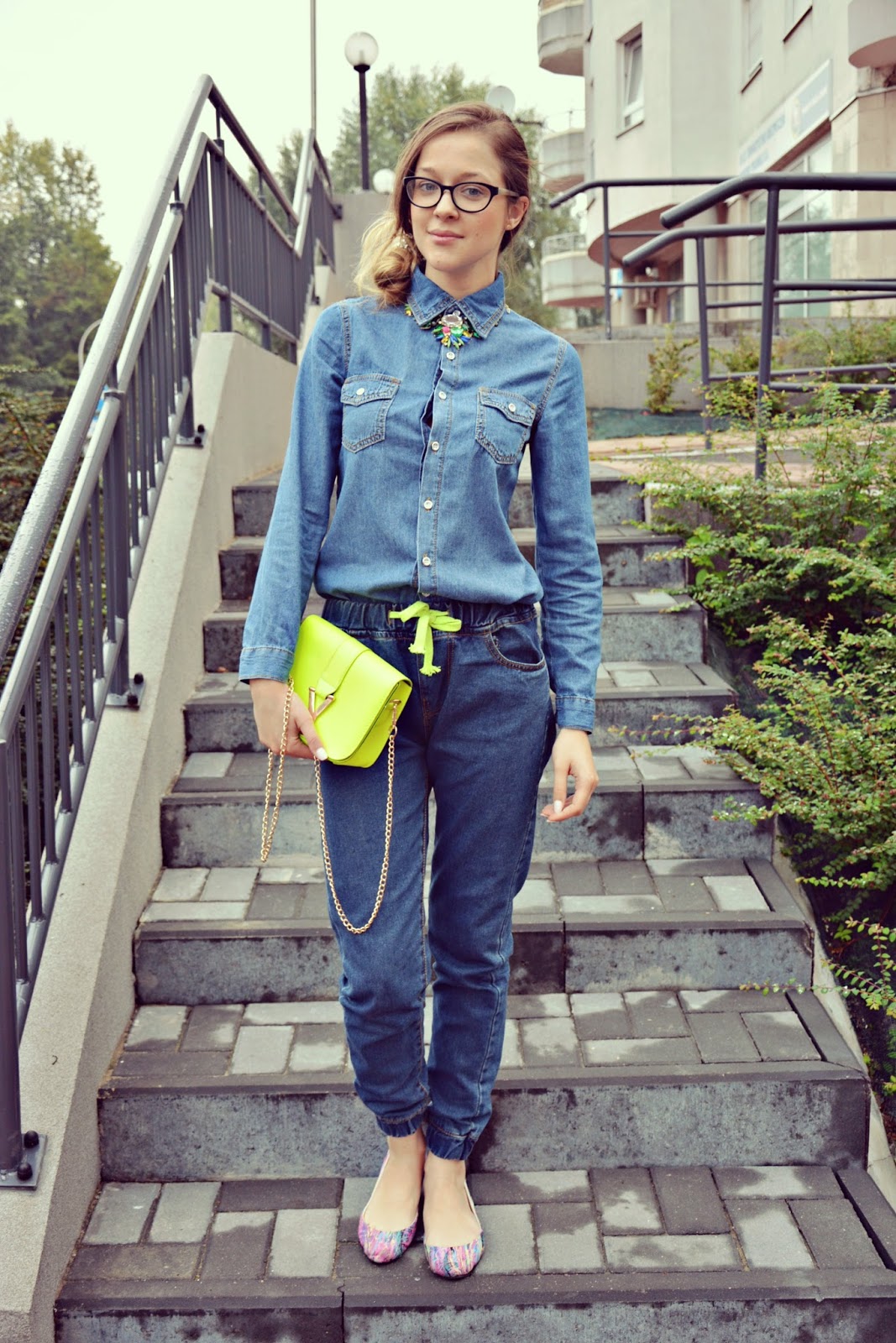Dzisiejsza stylizacja w całości składa się z jeansu. Szukałam swojej idealnej koszuli jeansowej (TUTAJ) już od dłuższego czasu. Poniżej prezentuję swój ideał – bez zbędnych udziwnień i dodatków, bez rozjaśnień na materiale. Prosta, zapinana na guziki z kieszonkami. Idealnie sprawdza się również w połączeniu z czarnymi legginsami. Jeansy (TUTAJ) w ciemniejszym kolorze tworzą spójną całość z koszulą. Spodnie zawiązywane są na neonowy sznurek – w moim przypadku to idealne rozwiązanie, ponieważ nie zawsze mogę znaleźć spodnie dopasowane w pasie, te są luźne, wygodne, mają ściągacze przy kostkach. Dla rozjaśnienia całej stylizacji dodałam neonową torebeczkę, kolorowy naszyjnik i balerinki – które w rzeczywistości wyglądają o wiele, wiele lepiej. Kupiłam je kiedyś na Allegro i z wielką chęcią kupiłabym sobie jeszcze ze trzy takie same pary. Jeśli ktoś wie gdzie mogę jeszcze takie dostać to bardzo proszę o wiadomość w komentarzu 🙂