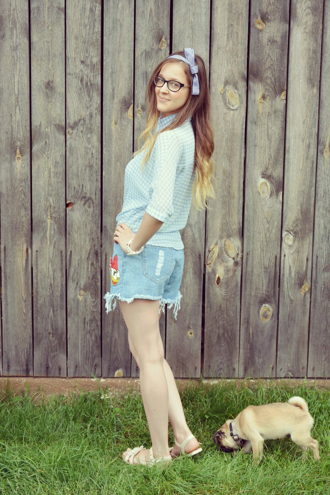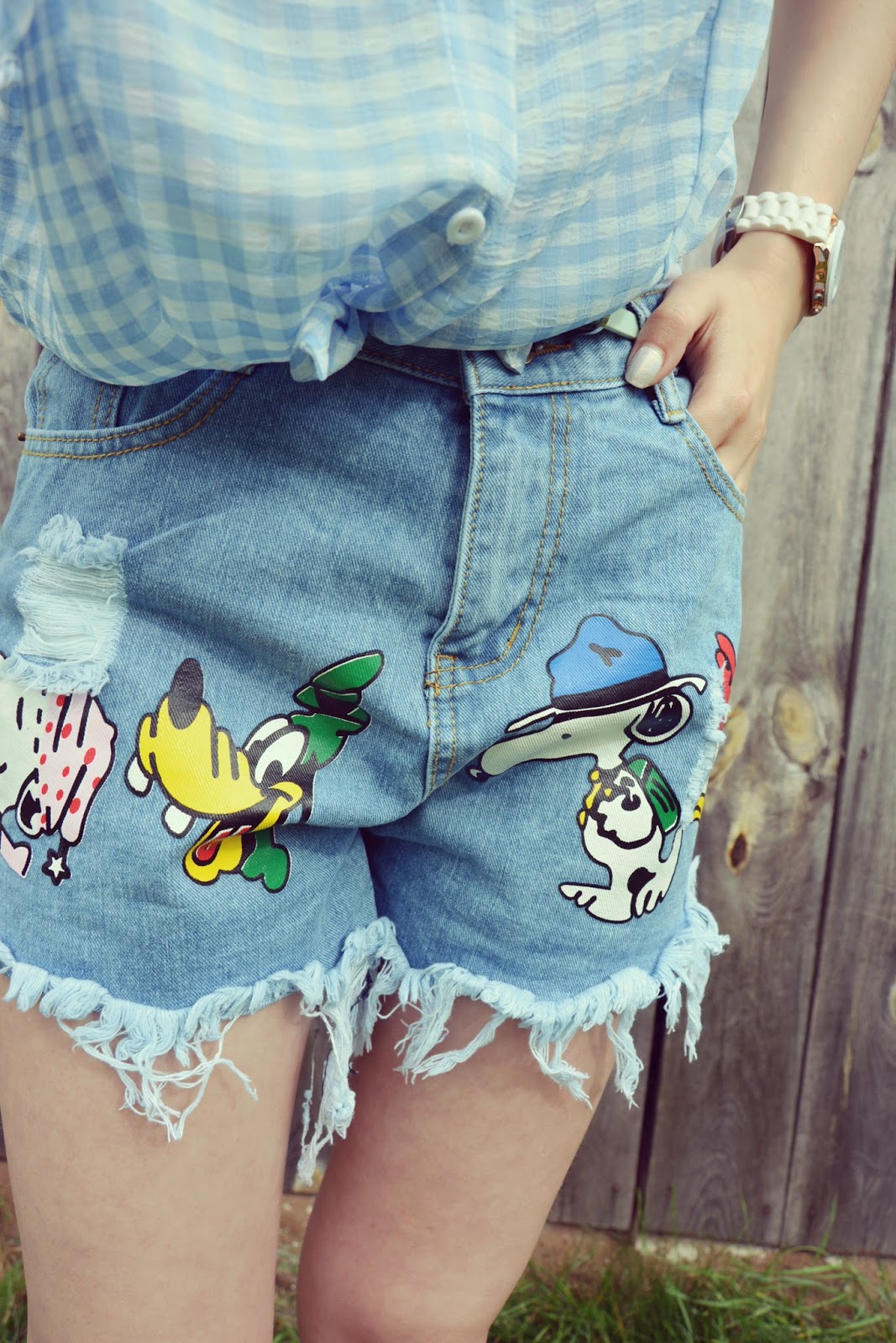 Kratka, krateczka – chyba nigdy nie wyjdzie z mody. Pasuje do jeansów, legginsów, czy spódnic, na elegancko i na sportowo. Warto mieć w swojej szafie choć jedną koszulę z tym motywem – u mnie sprawdza się najlepiej w sytuacjach beznadziejnych… hehe, czyli wtedy kiedy nie wiem co na siebie włożyć. Dzisiejsza stylizacja jest słodka. Koszula w kratę (TUTAJ) w połączeniu z jeansowymi szortami (TUTAJ) z motywem bajkowych postaci to dość zabawne, luźne zestawienie. Na włosach przewiązałam sobie tasiemkę w ciemniejszym odcieniu kratki w niż koszula, by nadać całej stylizacji dziewczęcego wyrazu. Buty to wygodne sandałki z frędzlami w odcieniu ciepłego beżu.