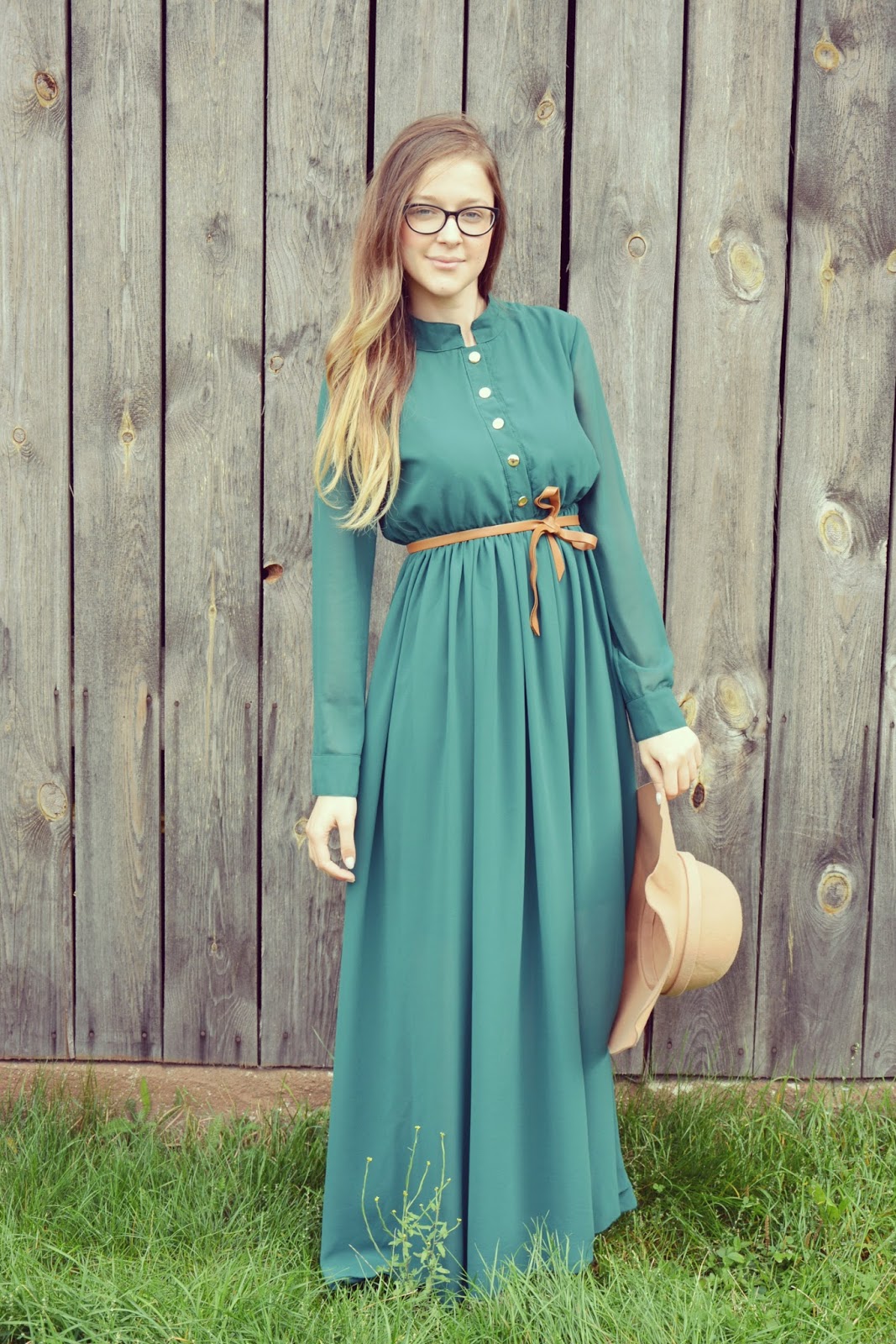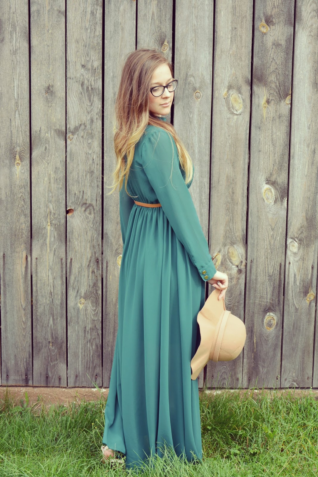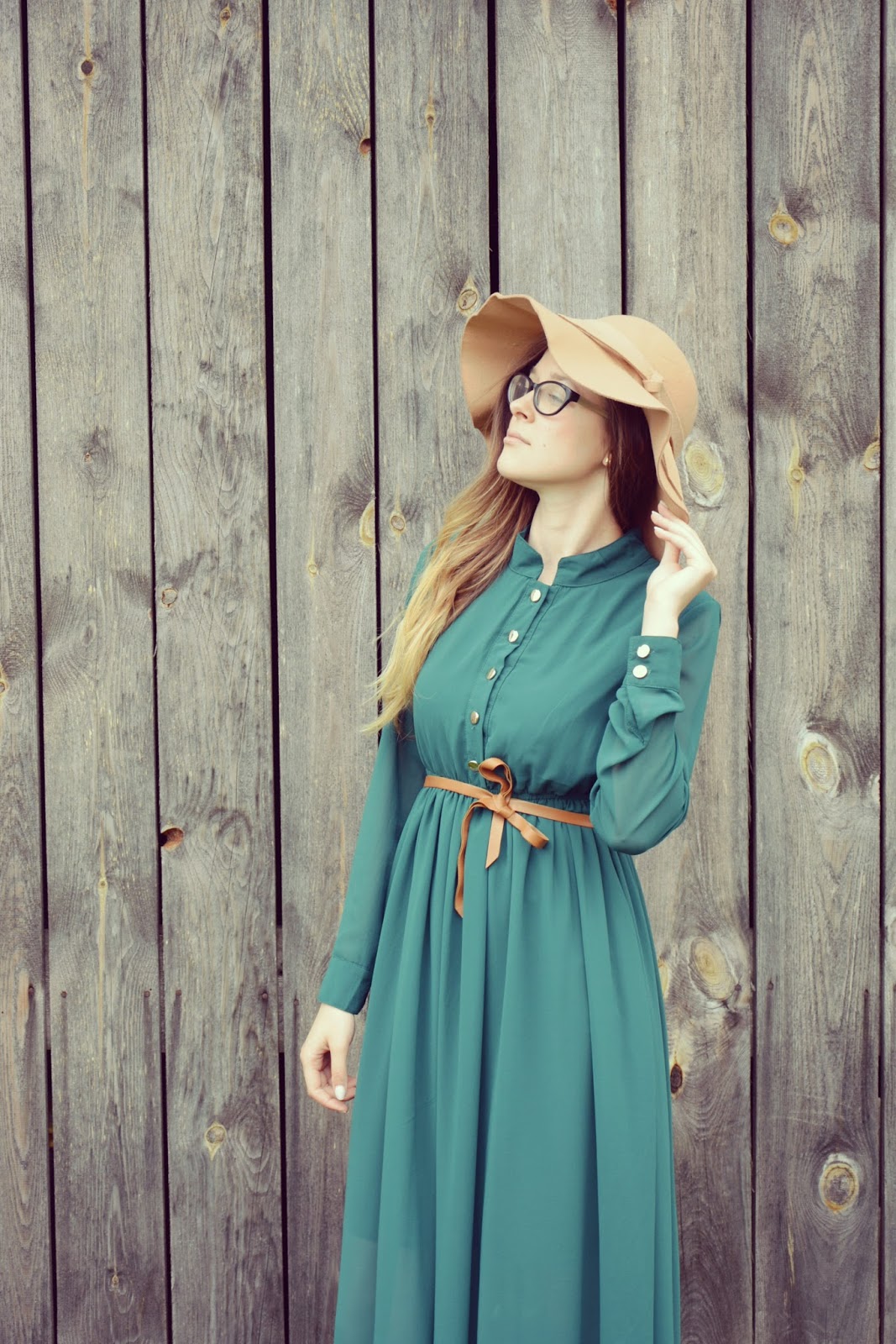 Dzisiejsza stylizacja miała pojawić się już bardzo, bardzo dawno. Chciałam zaprezentować wam tą suknię, jednak zrobienie ponad 200 zdjęć nie pomogło w opublikowaniu postu. Żadne z nich nie spełniało moich wymagań. Postanowiłam podejść jeszcze raz do sukni i zaprezentować ją w prosty i skromny sposób i ten okazał się najlepszy. Suknia maxki w kolorze pięknej, butelkowej zieleni została zamówiona przeze mnie TUTAJ. Dodatki to kapelusz i pasek w odcieniach brązu, które rozjaśniają głęboką zieleń sukni.