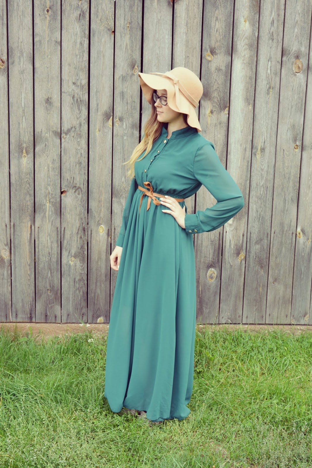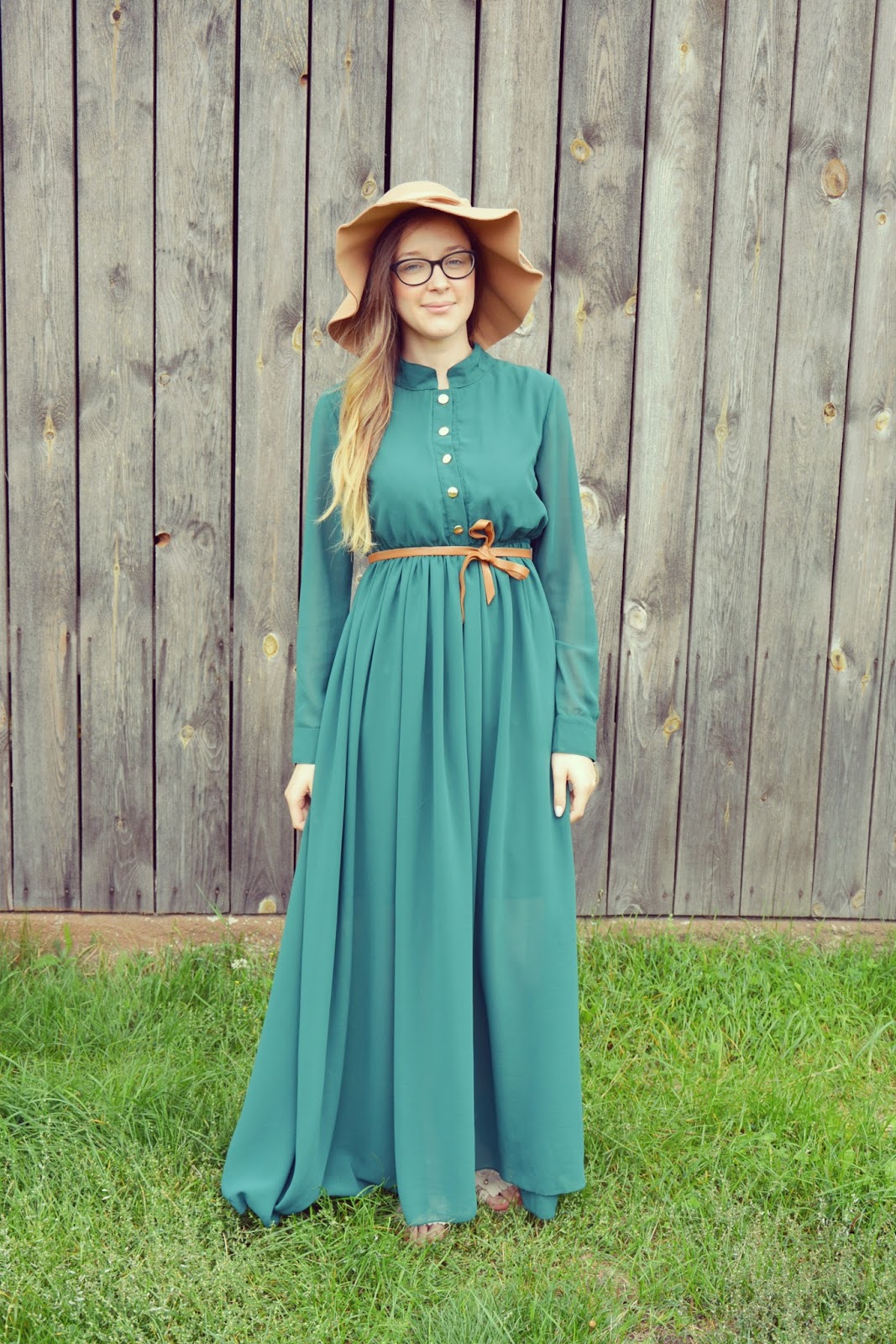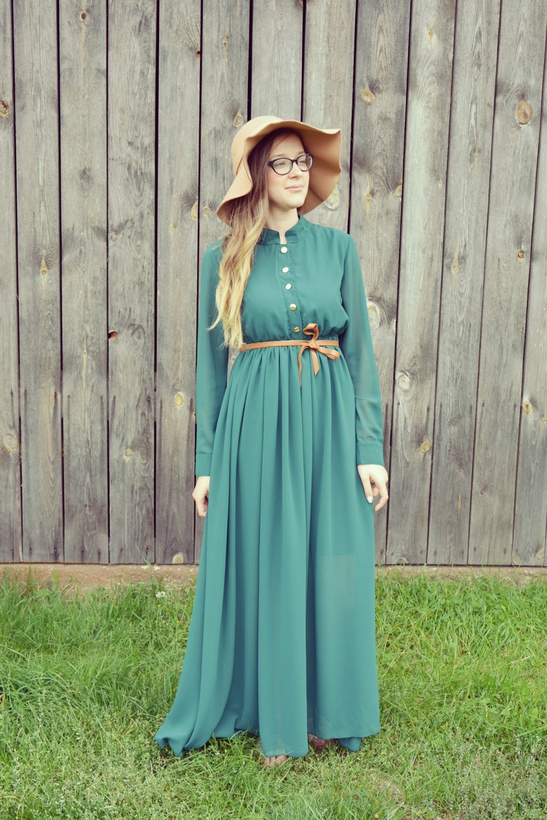 Dzisiejsza stylizacja miała pojawić się już bardzo, bardzo dawno. Chciałam zaprezentować wam tą suknię, jednak zrobienie ponad 200 zdjęć nie pomogło w opublikowaniu postu. Żadne z nich nie spełniało moich wymagań. Postanowiłam podejść jeszcze raz do sukni i zaprezentować ją w prosty i skromny sposób i ten okazał się najlepszy. Suknia maxki w kolorze pięknej, butelkowej zieleni została zamówiona przeze mnie TUTAJ. Dodatki to kapelusz i pasek w odcieniach brązu, które rozjaśniają głęboką zieleń sukni.