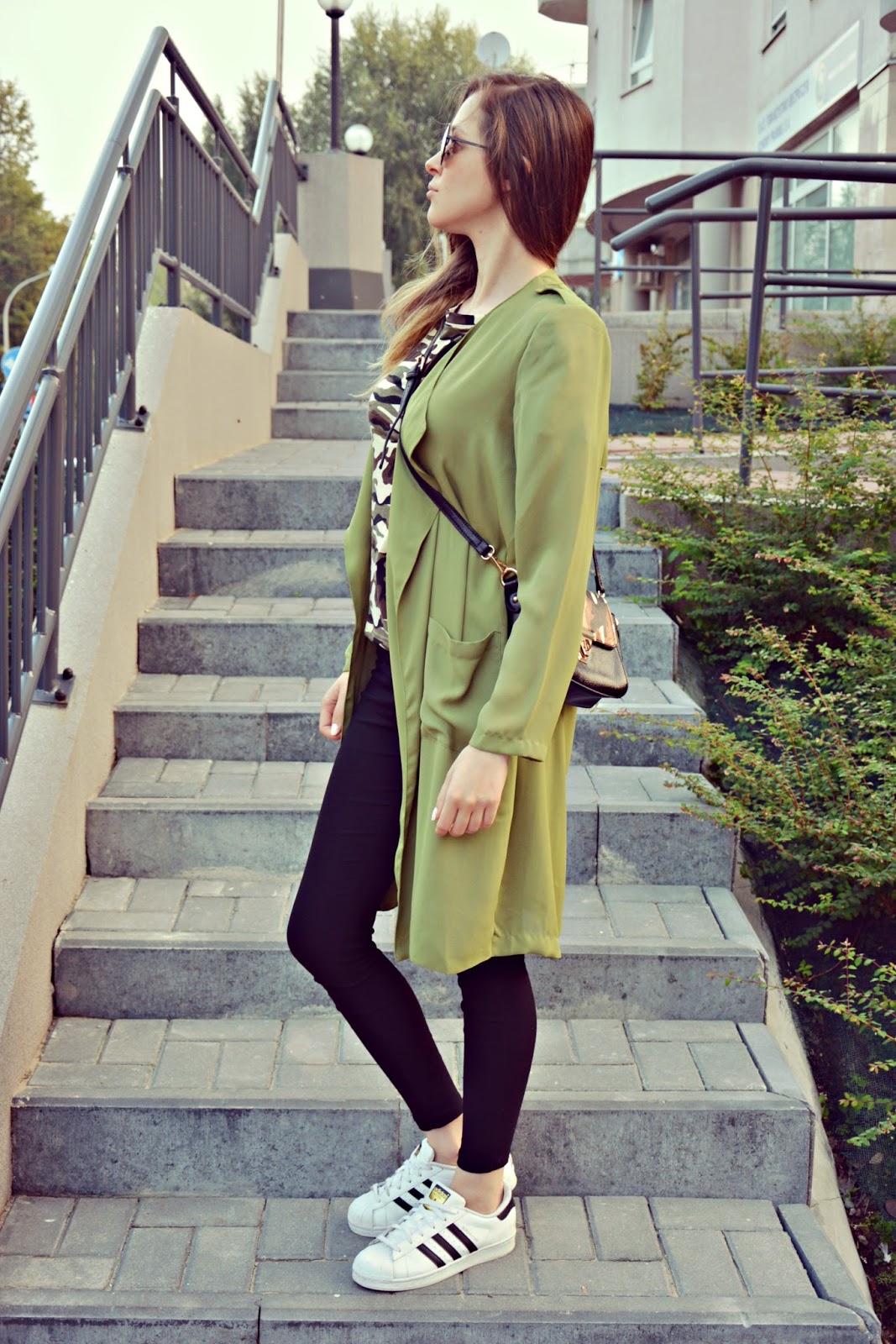 Dzisiejsza stylizacja w dwóch odsłonach na sportowo i na elegancko. Za pomocą dobranego obuwia w prosty sposób możemy zmienić wygląd i charakter całej stylizacji. Sami wybierzcie wariant, który wam bardziej odpowiada, z moim tempem życia ja stawiam zdecydowanie na wersję na sportowo 🙂 Pamiętajcie jednak o tym, że moda w życiu to nie wszystko – to coś co daje szczęście, ale nie popadajmy w modową próżność i kierujmy się cytatem przedstawionym poniżej. Moja dzisiejsza stylizacja składa się z koszulki moro (TUTAJ) która jest bardzo wygodna i miła w dotyku, ponieważ wykonana jest w 100% z bawełny. Do bluzeczki dobrałam torebeczkę z motywem moro (TUTAJ), na pasku z możliwością regulowania jego długości oraz z bezpiecznym zamknięciem na zip. Na ramionach mam narzutkę/płaszczyk (TUTAJ) w kolorze oliwkowej zieleni. Prezentowałam wam ją już TUTAJ w poście w bardziej eleganckiej odsłonie. Spodnie widzieliście już nie raz, dopasowane, podkreślają kształty z przodu z zipem (TUTAJ). Obuwie tak jak zapowiedziałam na wstępie to sportowe Adidasy oraz eleganckie sandałki na szpilce od Merg.pl.
