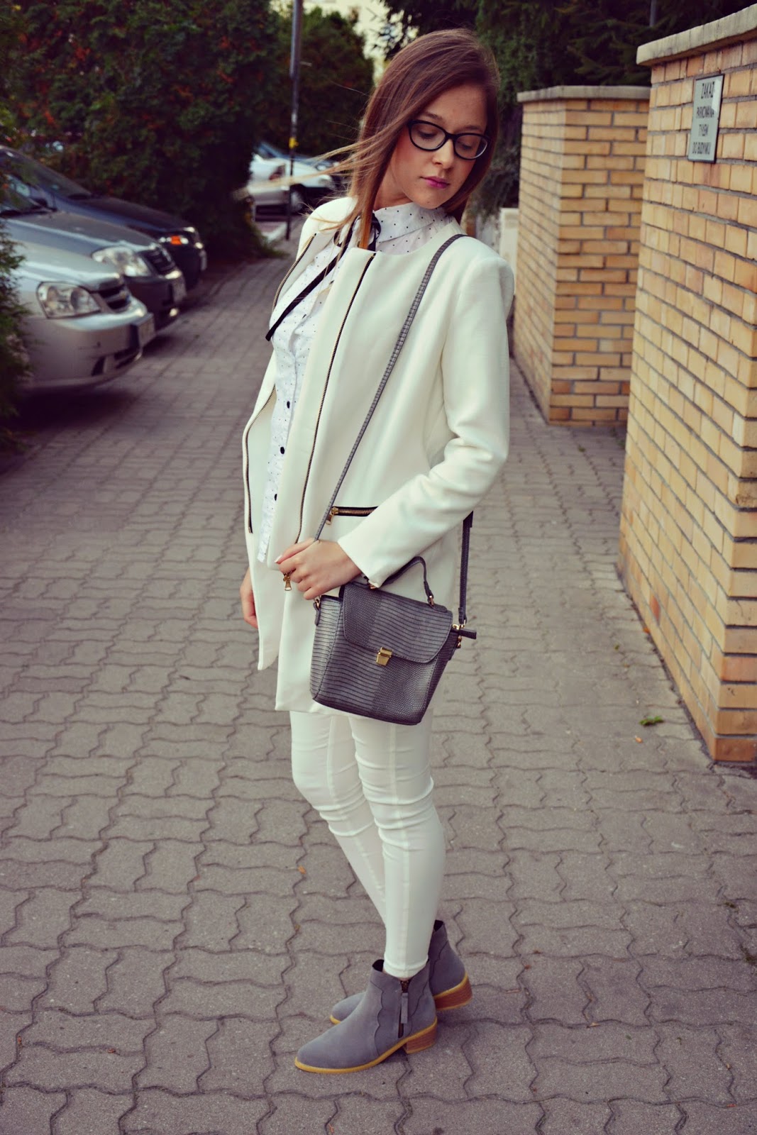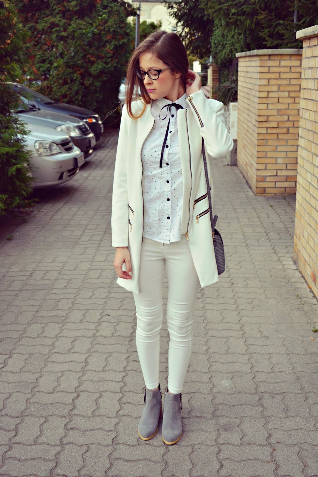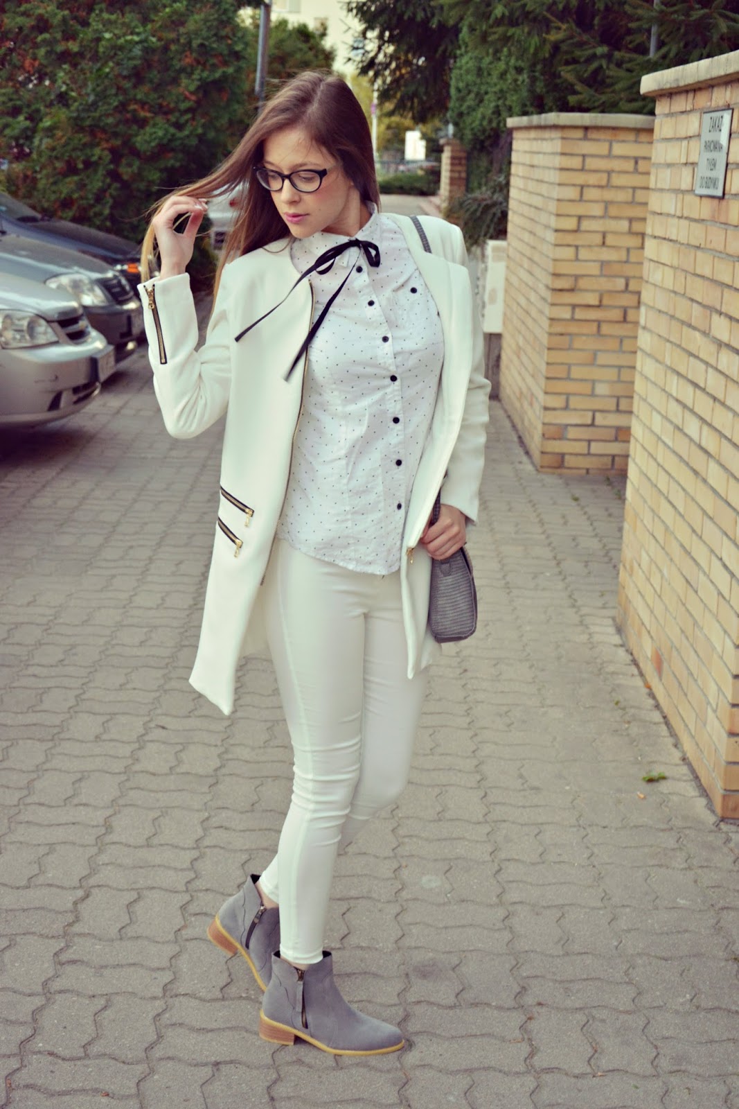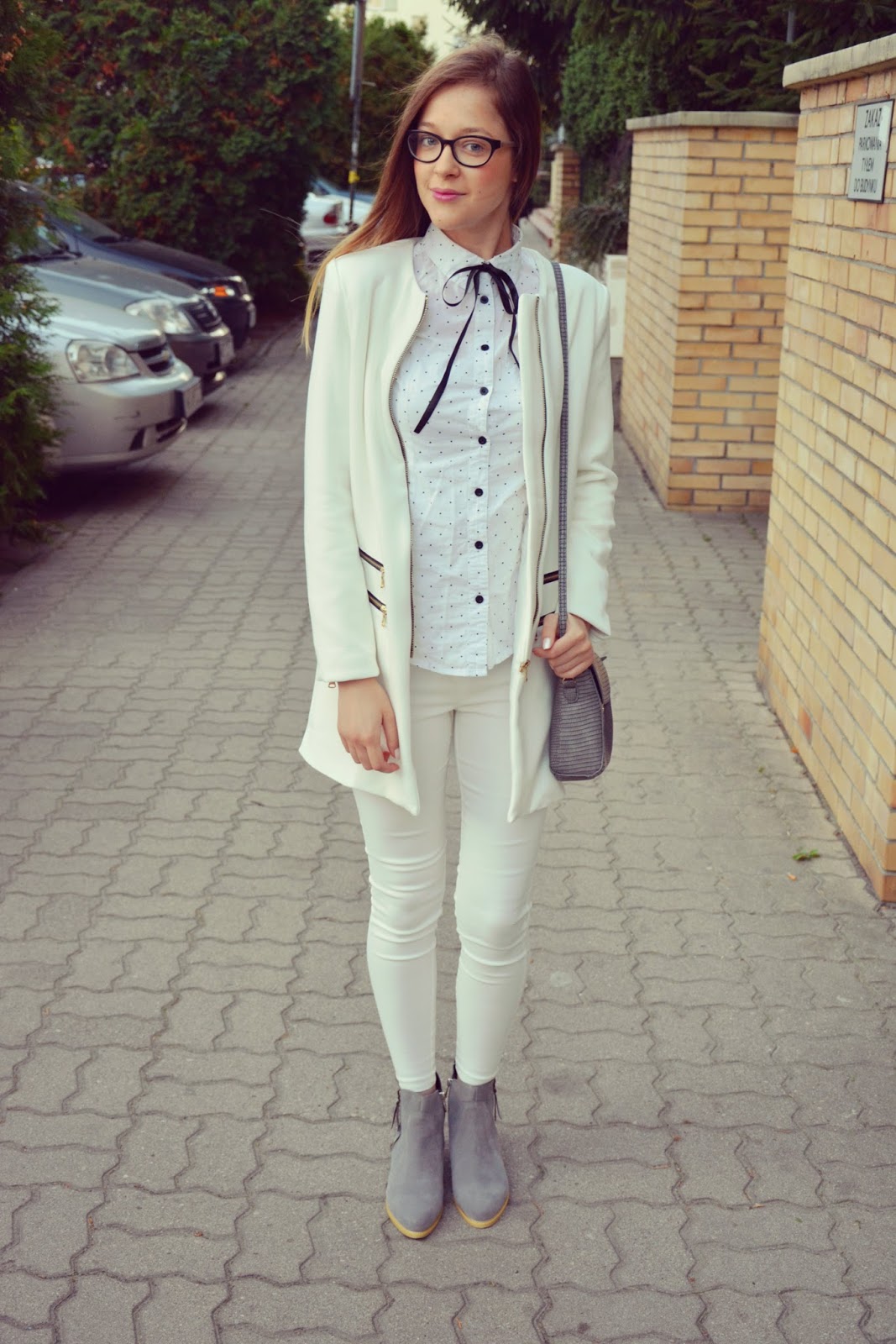Dzisiejsza stylizacja w bieli z dodatkiem szarości. Płaszczyk (TUTAJ) skrojony jest jak na miarę! Polecam każdemu, ponieważ widząc go nawet na zdjęciach na innych osobach na każdej z nich wygląda fenomenalnie. Zasuwany na zamek, uszyty z dobrej jakości materiału o długości na pół uda – idealny na cieplejsze jesienne lub chłodniejsze wiosenne dni. Biała koszula w czarne groszki została podkreślona wstążką zawiązaną przy kołnierzyku w kokardkę. Doskonale dopasowane spodnie (TUTAJ) podkreślają smukłą sylwetkę. Dla przełamania bieli dodatki w postaci butów (TUTAJ) oraz torebki (TUTAJ) w kolorze szarości.