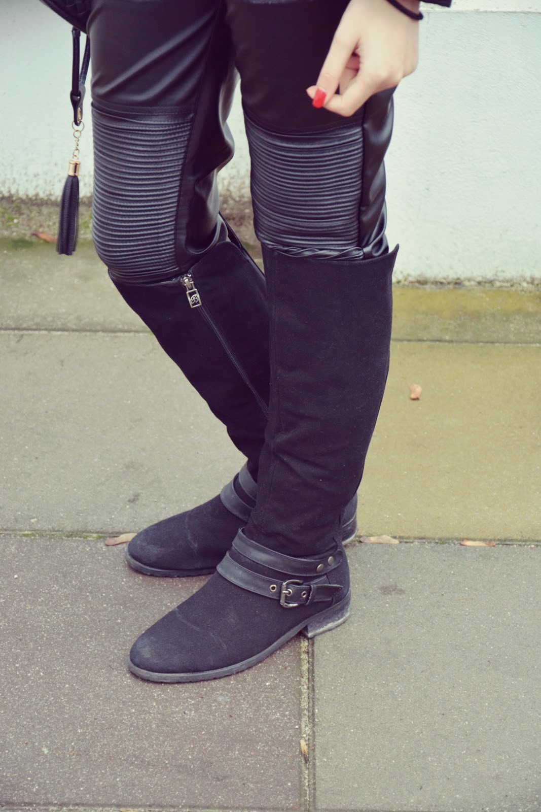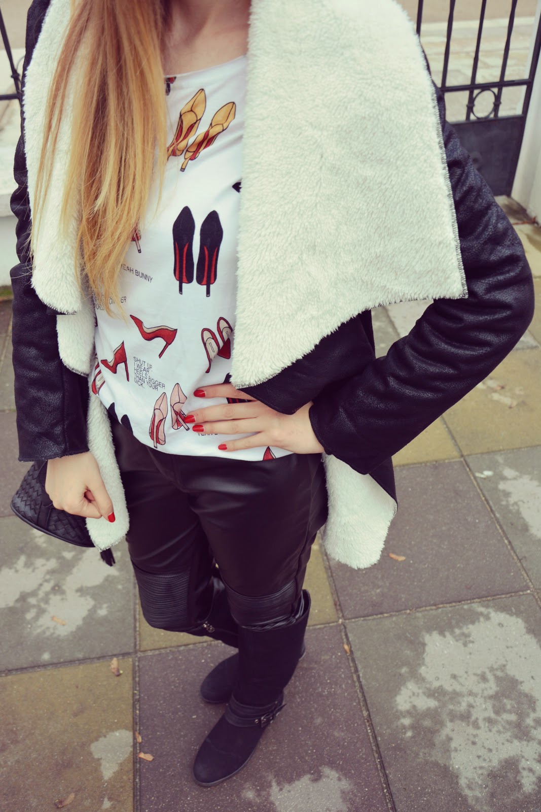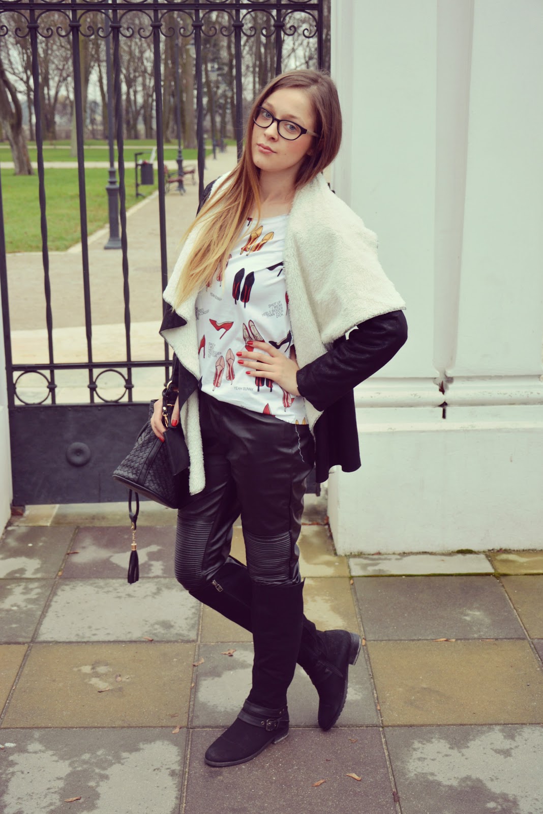 Dzisiejsza stylizacja oczywiście w czerni, którą kocham. Kożuszek (TUTAJ) bardziej niż na zimę nadaje się na jesienne dni. Nie jest to typowy kozuch zimowy. Lekki, zwiewny z mięciutkim „barankiem”. Spodnie (TUTAJ) dość ostre z eko-skóry, z zakładkami na kolanach i zipami po bokach dają całej stylizacji odrobinę charakteru. Muszkieterki idealne na jesień jak i na zimę. Bluzka w szpilki to moja ulubiona – widzieliście już ją na blogu i zapewne zobaczycie jeszcze nie raz 🙂 Torba (TUTAJ) z plecionki nadaje szyku całości.