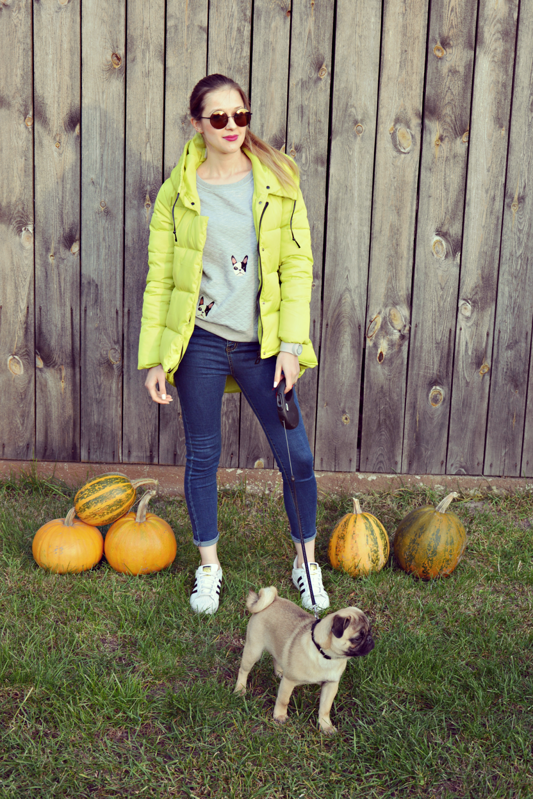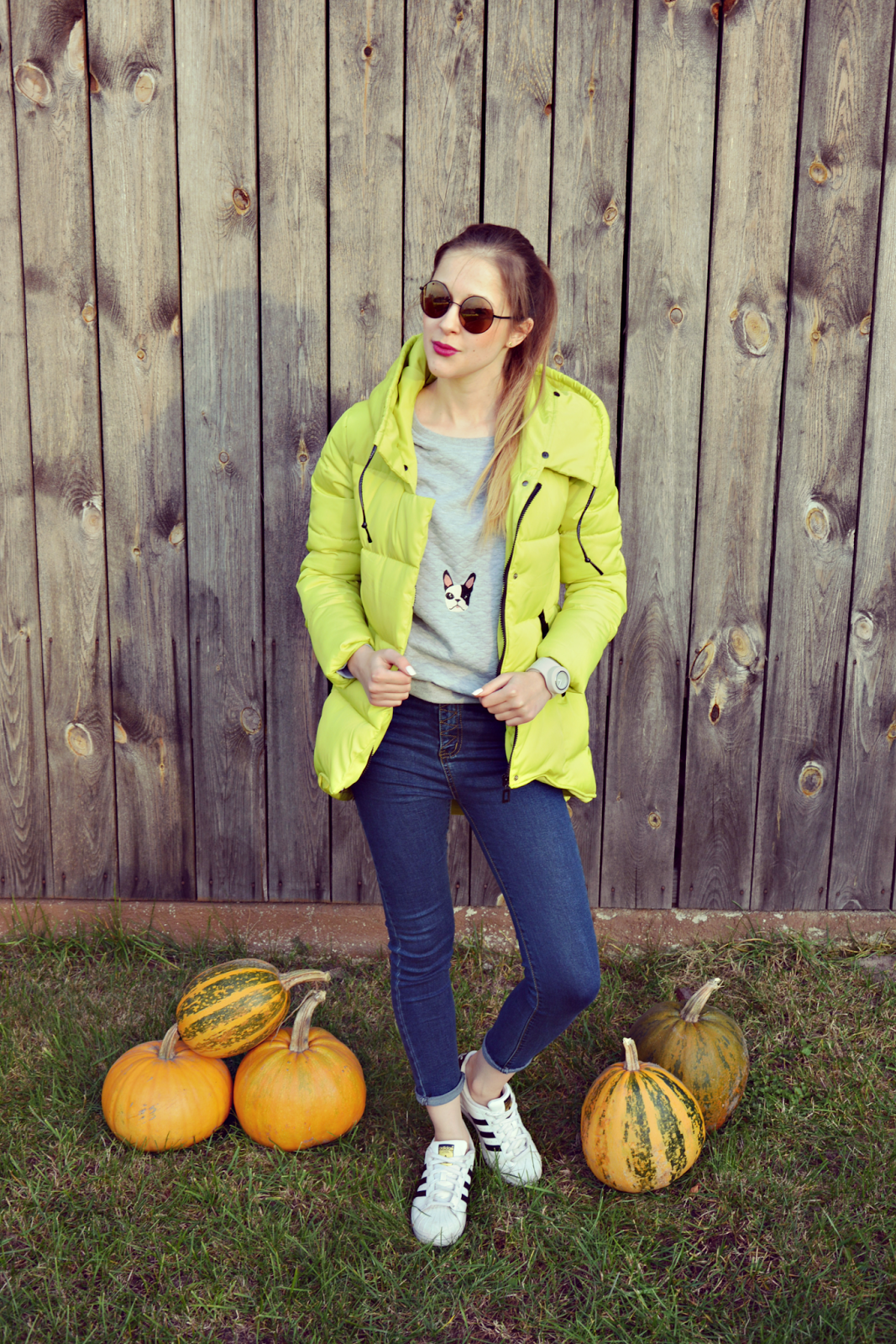 Kurtka w kolorze limonki jest wam za pewne dobrze znana. Rzuca się w oczy więc już dwie osoby stojące na przystanku, czy jadące w autobusie w takiej kurtce to już tłum hehe Nie dziwie się jednak, że wiele osób zaryzykowało i wybrało właśnie ten fason i ten kolor. Mi samej strasznie się ta kurtka podoba, ponura pogoda i tak daje za dużo szarości. Promienny akcent w postaci kurtki na mnie samą działa bardzo pozytywnie. Wygodne jeansy (TUTAJ) z pięknie wykończonym pasem oraz bluza w buldożki francuskie (TUTAJ) to duet idealny na spacery z moim pasiakiem. Na nogach oczywiście wygodne Adidasy. Nieodzowny element jesiennych stylizacji to oczywiście zegarek. Sprawi, że wrócimy do domu na czas, nie przesadzimy z długością jesiennych spacerów, nie spóźnimy się na spotkanie oraz oczywiście pozwolą kontrolować czas przez długie, jesienne wieczory. Mój numer jeden to zegarek marki SLAP Watch Poland. W pięknym odcieniu szarości. SLAP to innowacyjne rozwiązanie jeśli chodzi o zegarki ale o tym w jednym z najbliższych postów.